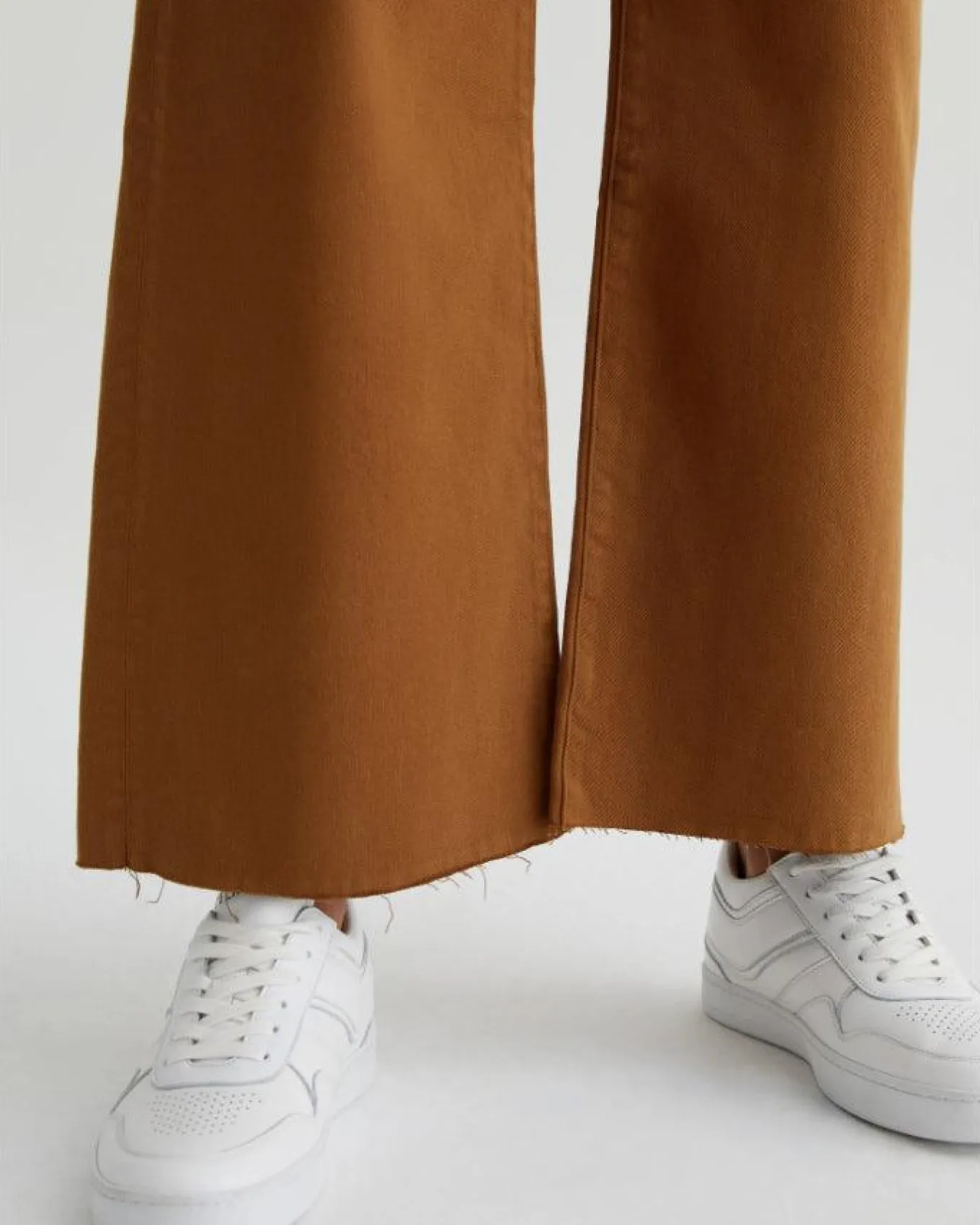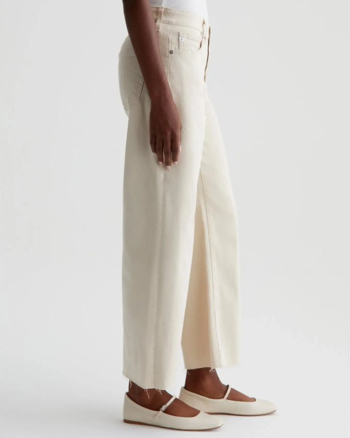 AG Jeans wide leg high rise jeans with loose cropped legs, raw hems, classic five pocket styling, button and zip closure, cloud soft dual-elastric stretch denim offers extra comfort and resilient shape. Front Rise 10 1/4″, Inseam 27″, Bottom Opening 21″, Knee Opening 20 1/4″.