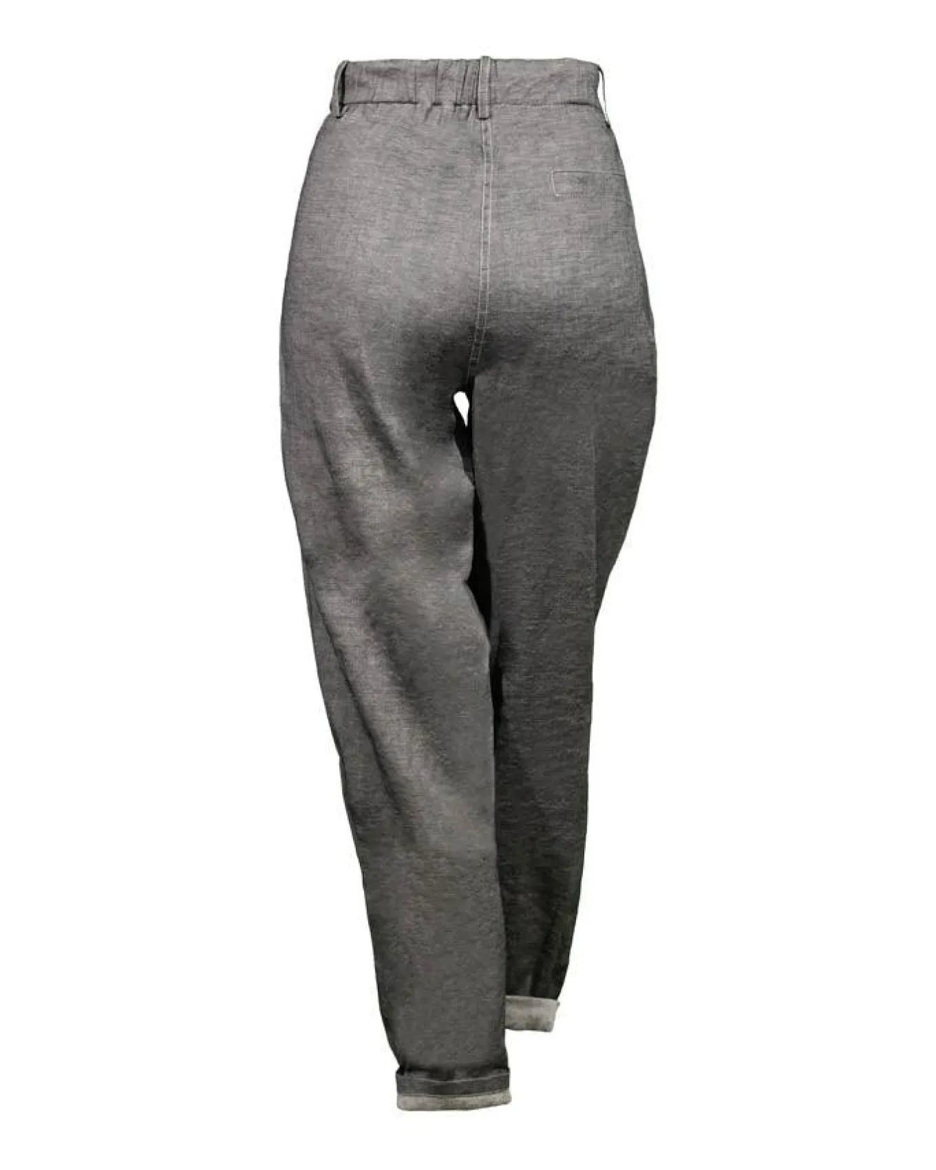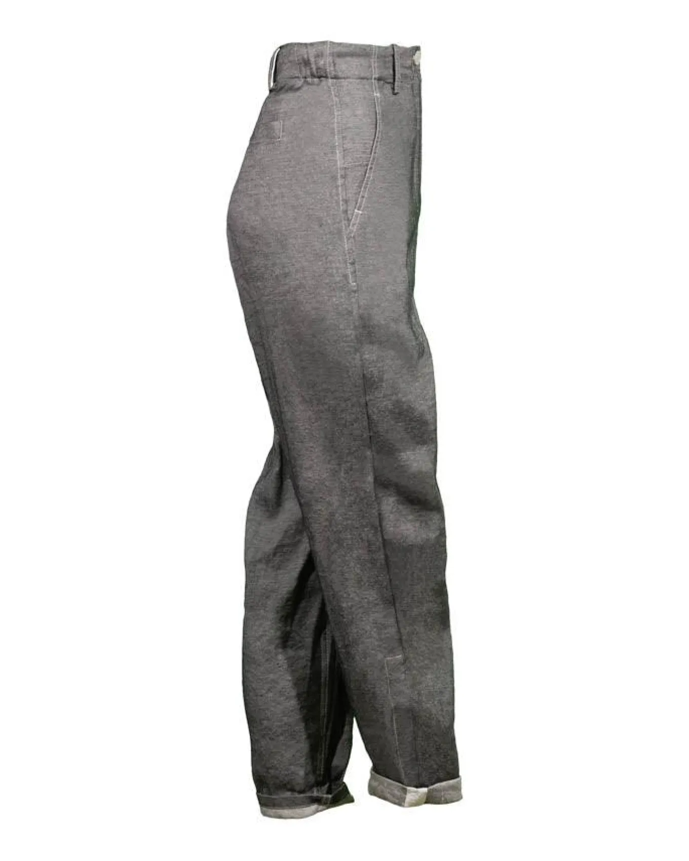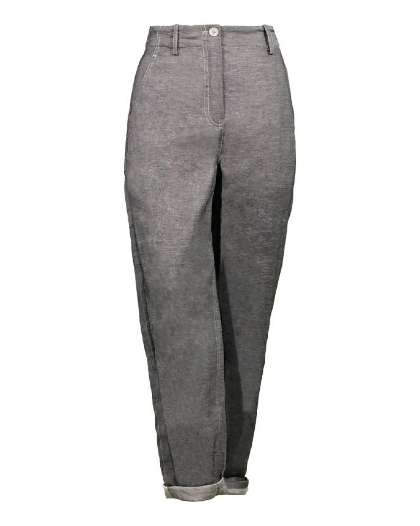 Annette Gortz linen blend twill weave tapered, cropped pant with slant front pockets, a welt back pocket, grosgrain ribbon detail at hem, roll hem, button and zip closure.