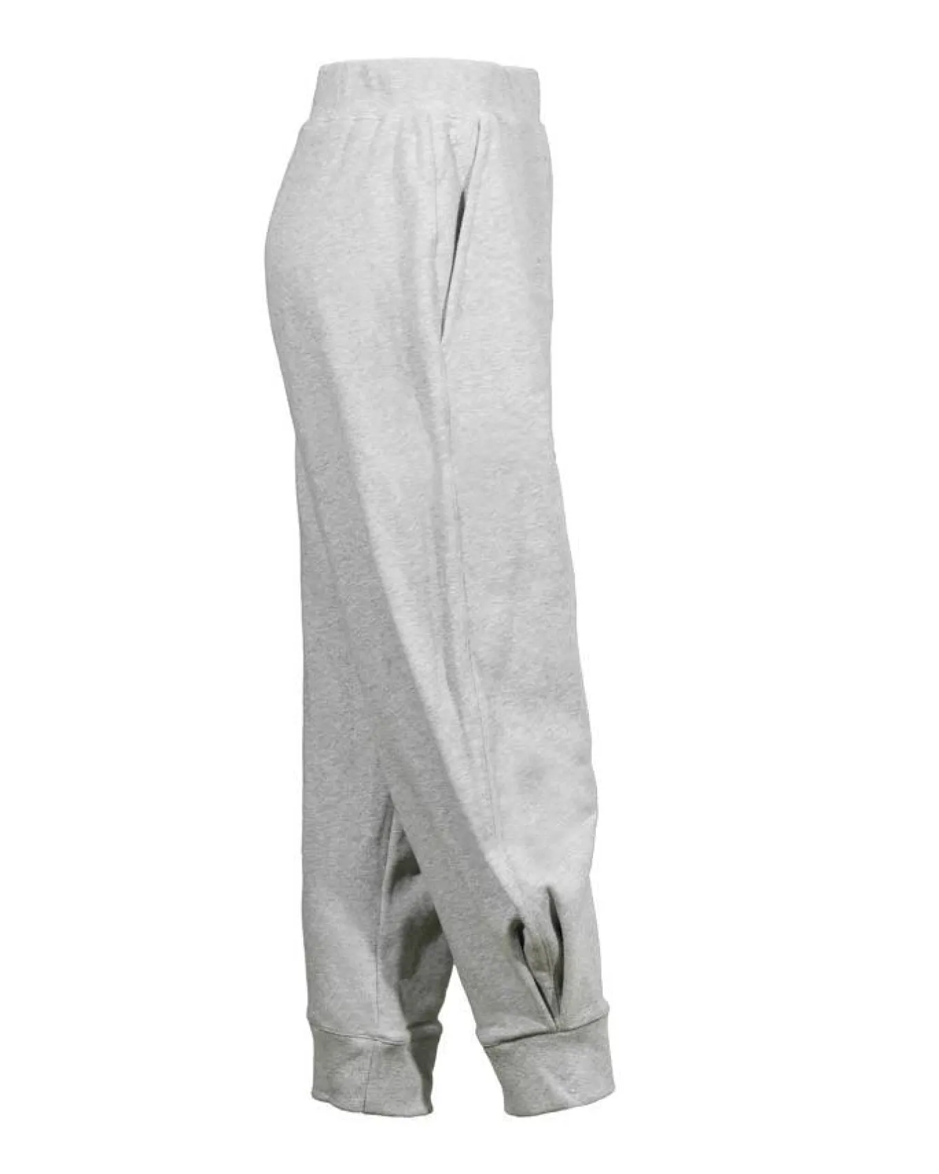 Ayrtight heavyweight french terry jogger style pant with wide elastic waistband, gracious slash pockets, 7/8 length, pleat detail on outside cuffs create a flattering tapered look