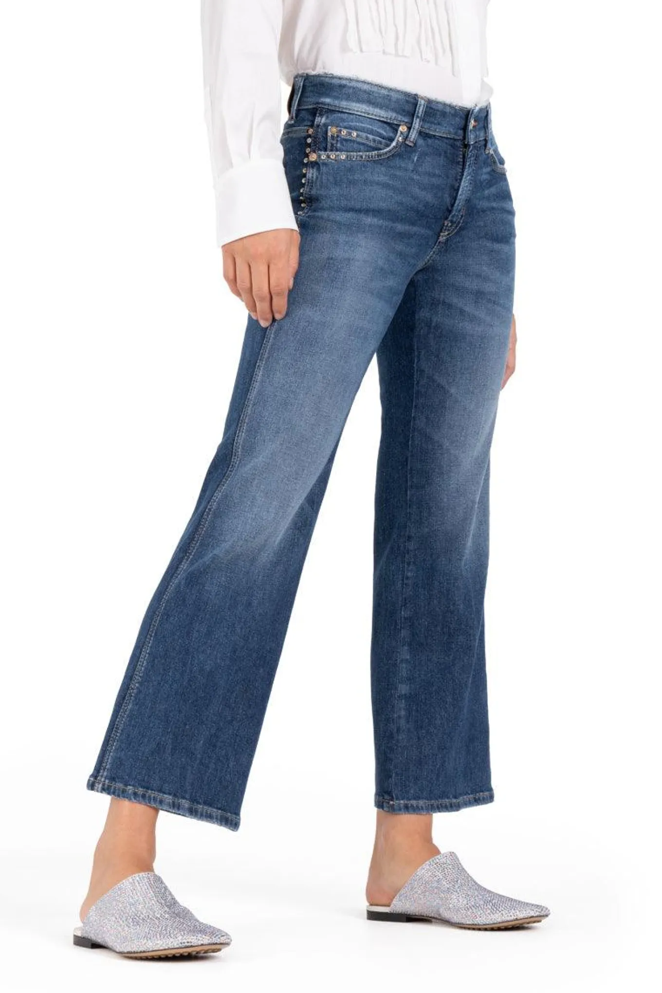 Cambio cropped straight leg jeans with slight flare, classic five pocket styling, contrast eye catching studded pocket trim detail, raw edge waist, button and zip closure, Size 32 – Length 28″.