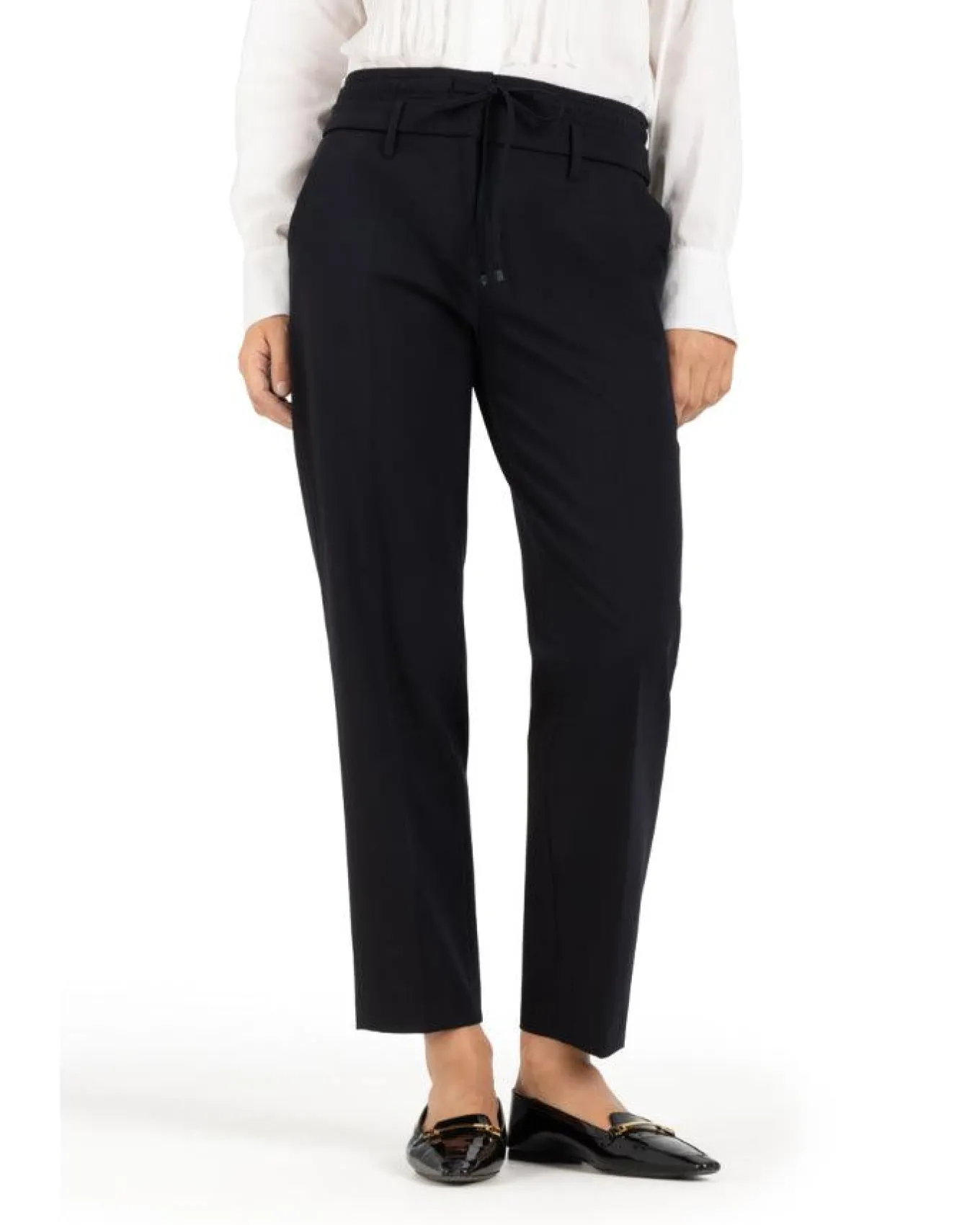 Cambio double waist ankle pant with straight leg silhouette, elastic waistband with drawstring topperfor perfect fit, side pockets and back welt pockets, Size 32 – Inseam 28″.
