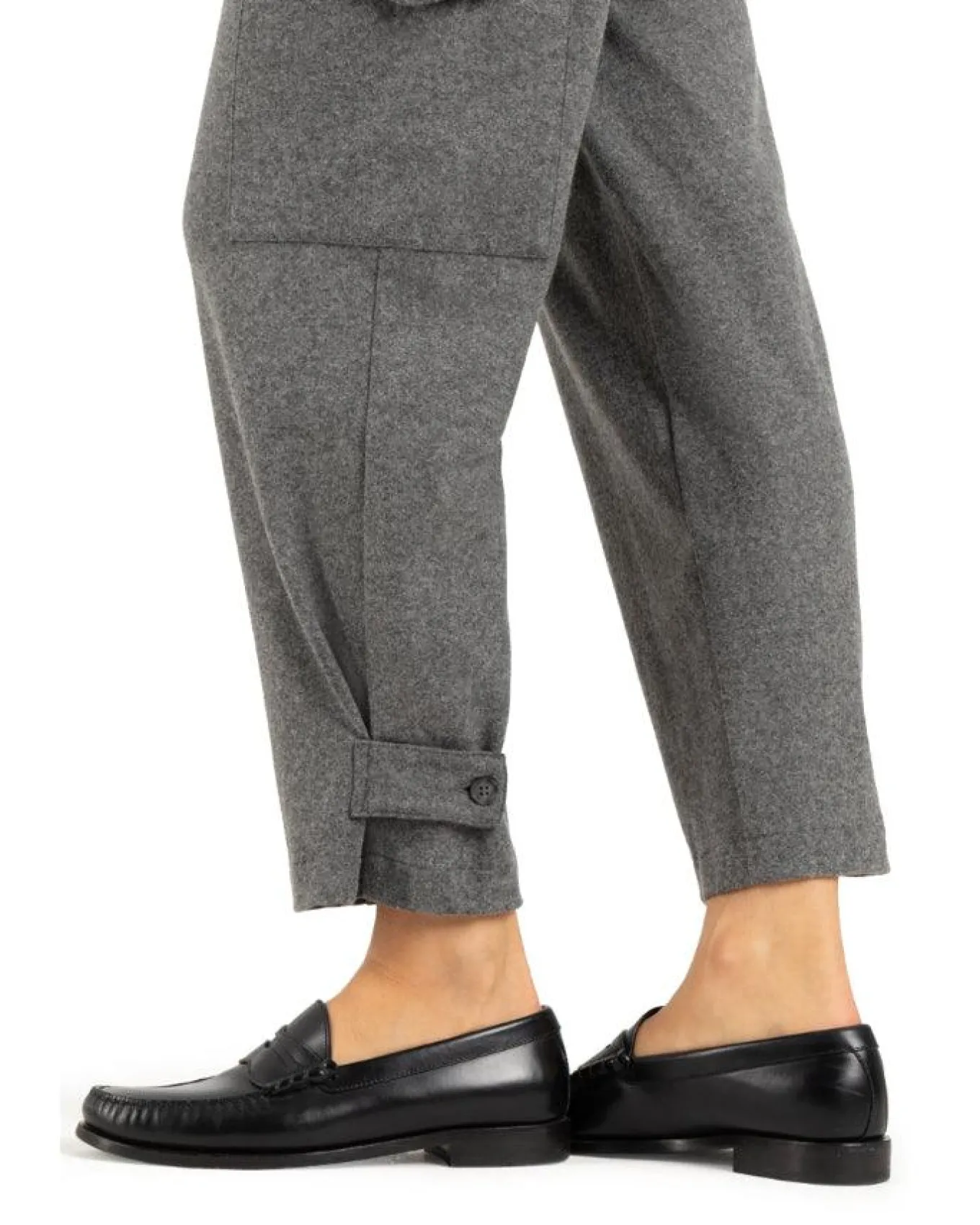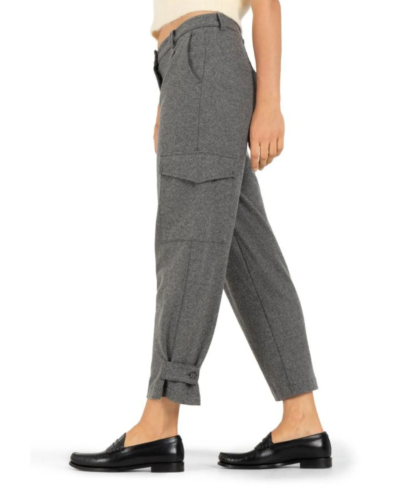 Cambio trendy, lightweight wool blend cropped pants with front pleat, cargo pockets, front slant pockets, back welt pockets, tapered leg with adjustable button ankle tab, button and zip closure, Size 32 – Length 28″.