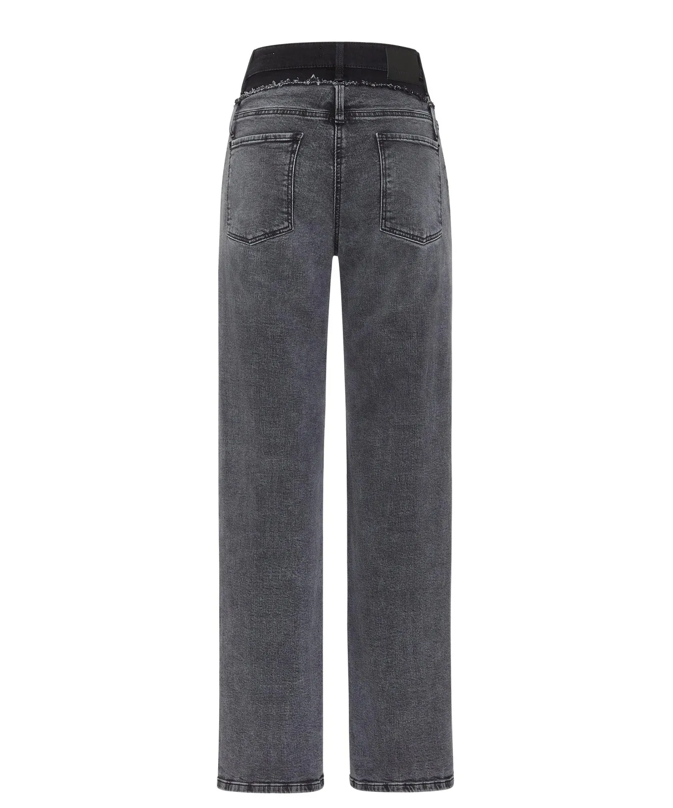 Cambio soft feel stretch denim straight, wider legjeans features a two tone double waist with raw edge seam detail, classic five pocket styling, button and zip closure, high rise, Size 32 – Length 34″.