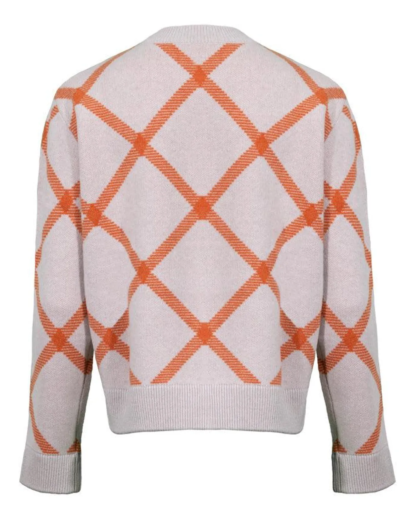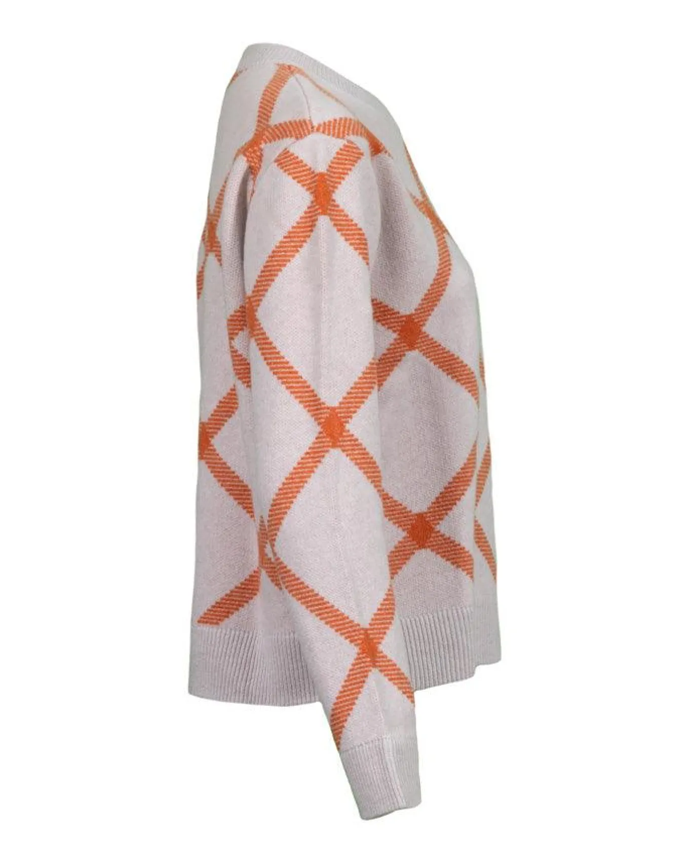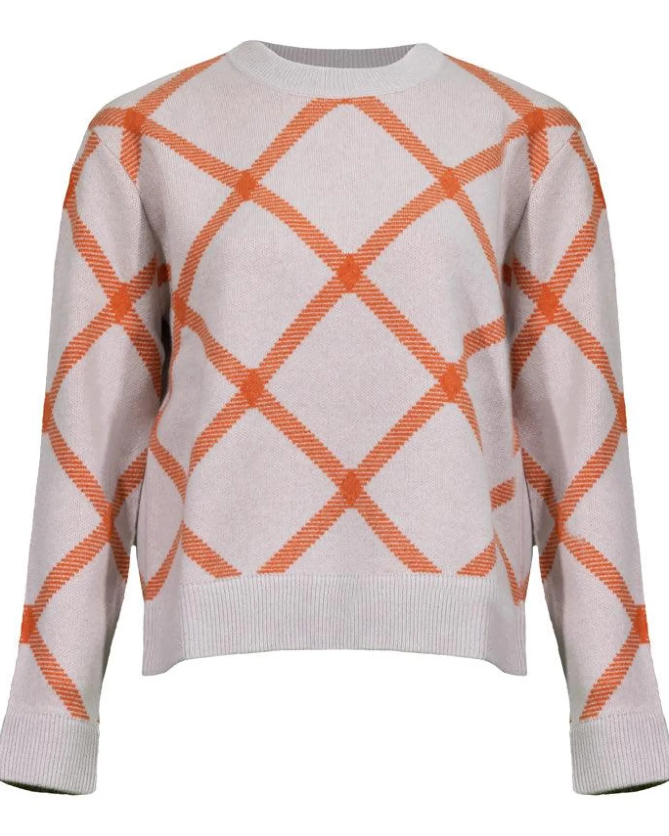 Luxuriously soft cashmere bias plaid sweater with an orange lattice lines for pop of color, crew neck and ribbed trim.