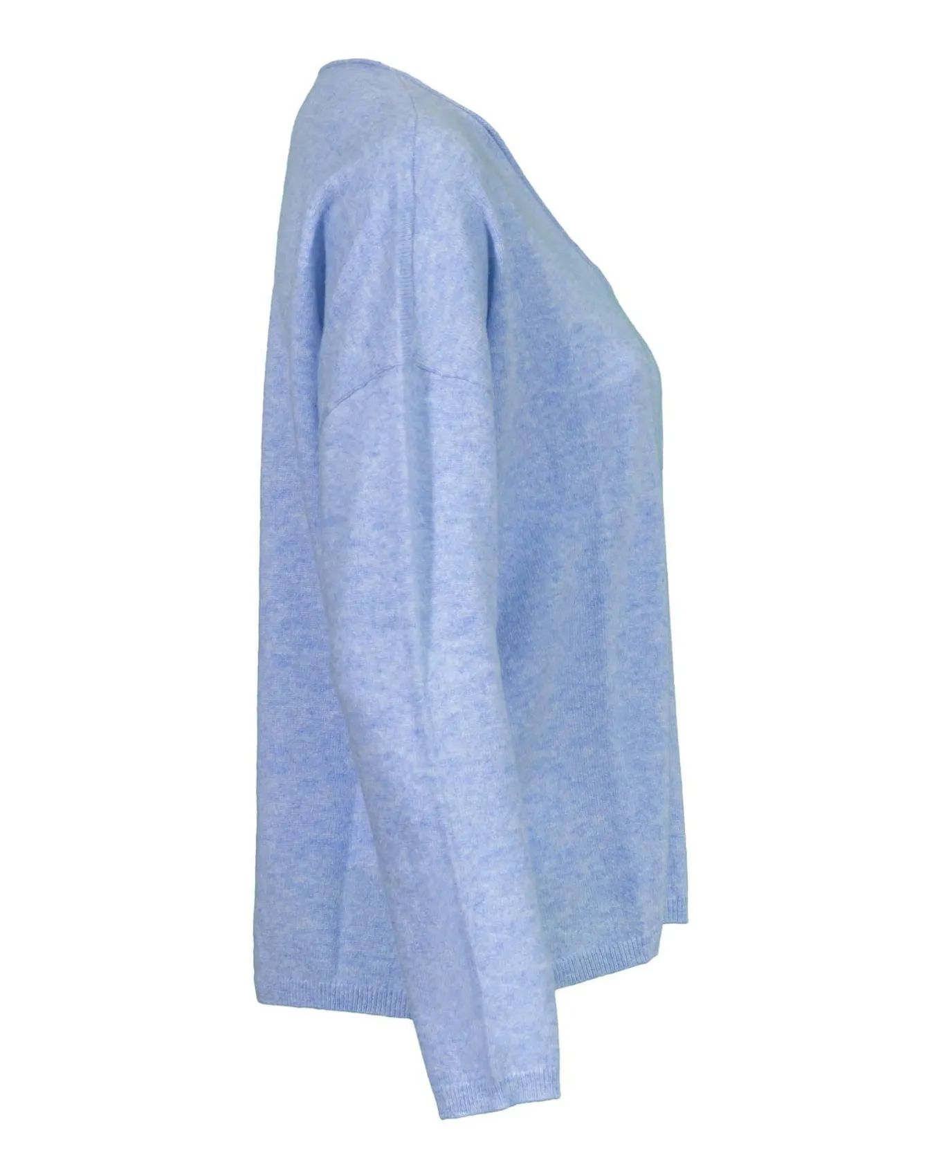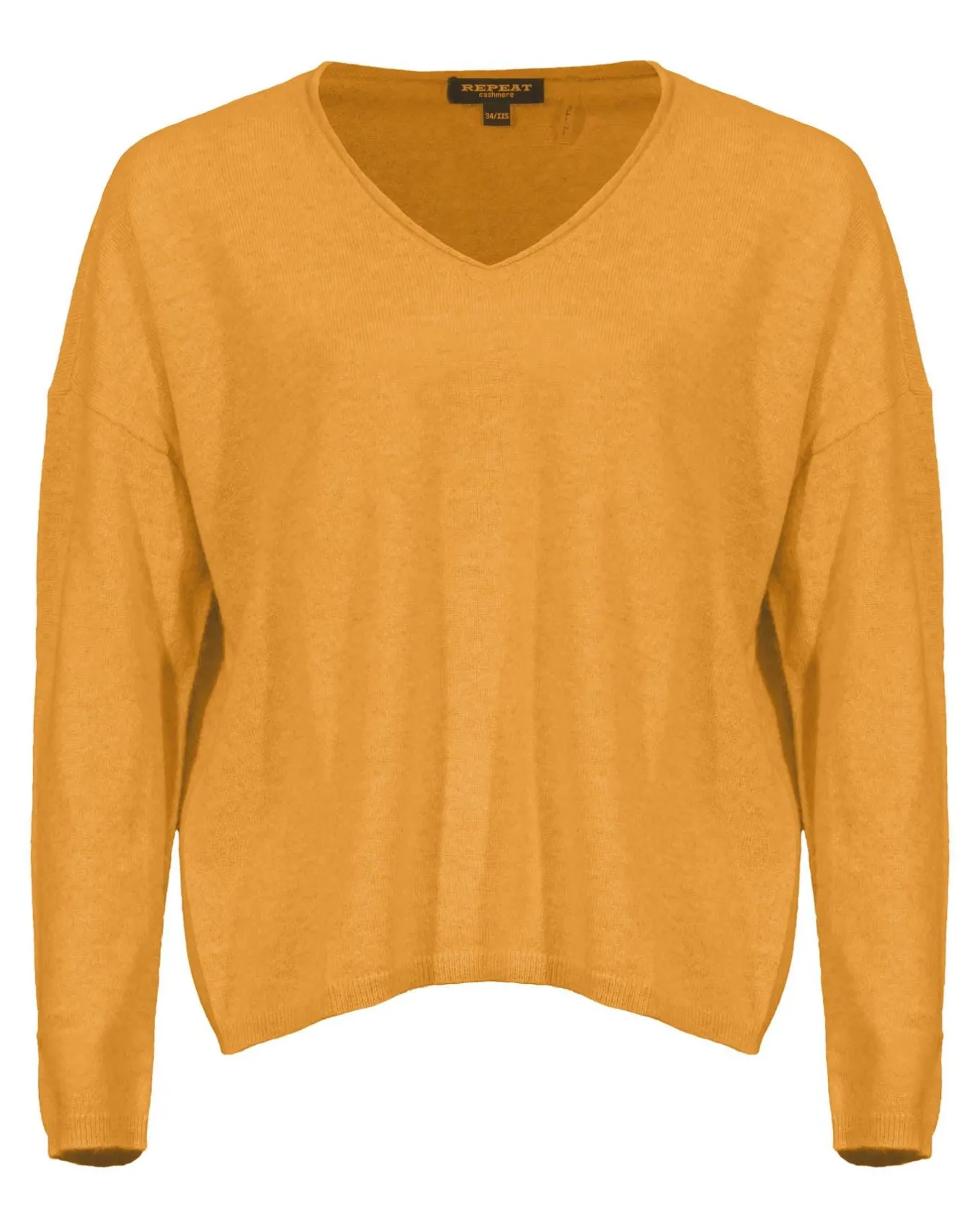 Relaxed fit cashmere knit v-neck pullover with drop shoulders, rolled neck trim and fine ribbed trim at cuffs and hem