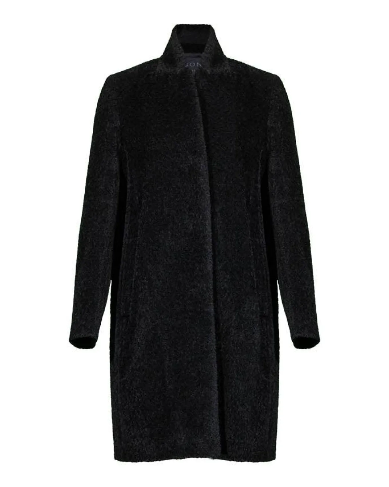 Cinzia Rocca straight cut mid length wool alpaca blend coat with inverted notch collar, 3 hidden snap button closure and welt pockets, Length 35.4″.
