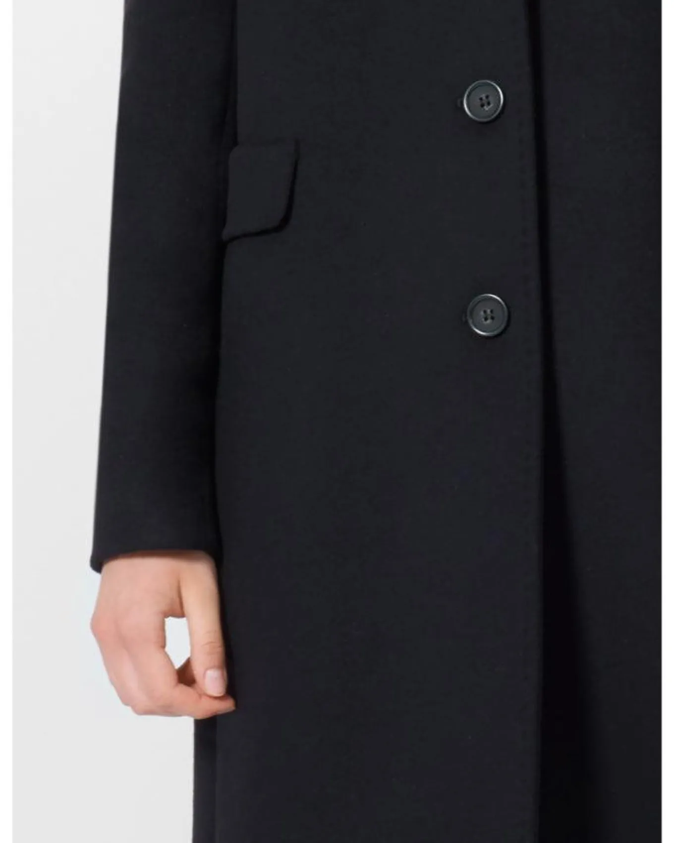 Cinzia Rocca straight cut knee length wool cashmere blend coat with notch collar, saddle stitch detail, 3 button closure and flap pockets. Length 37.4″.