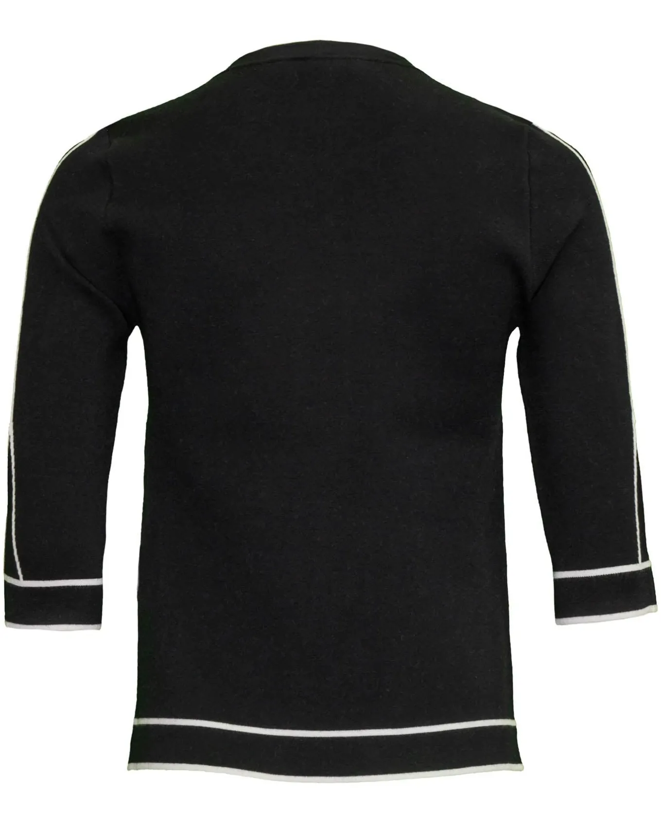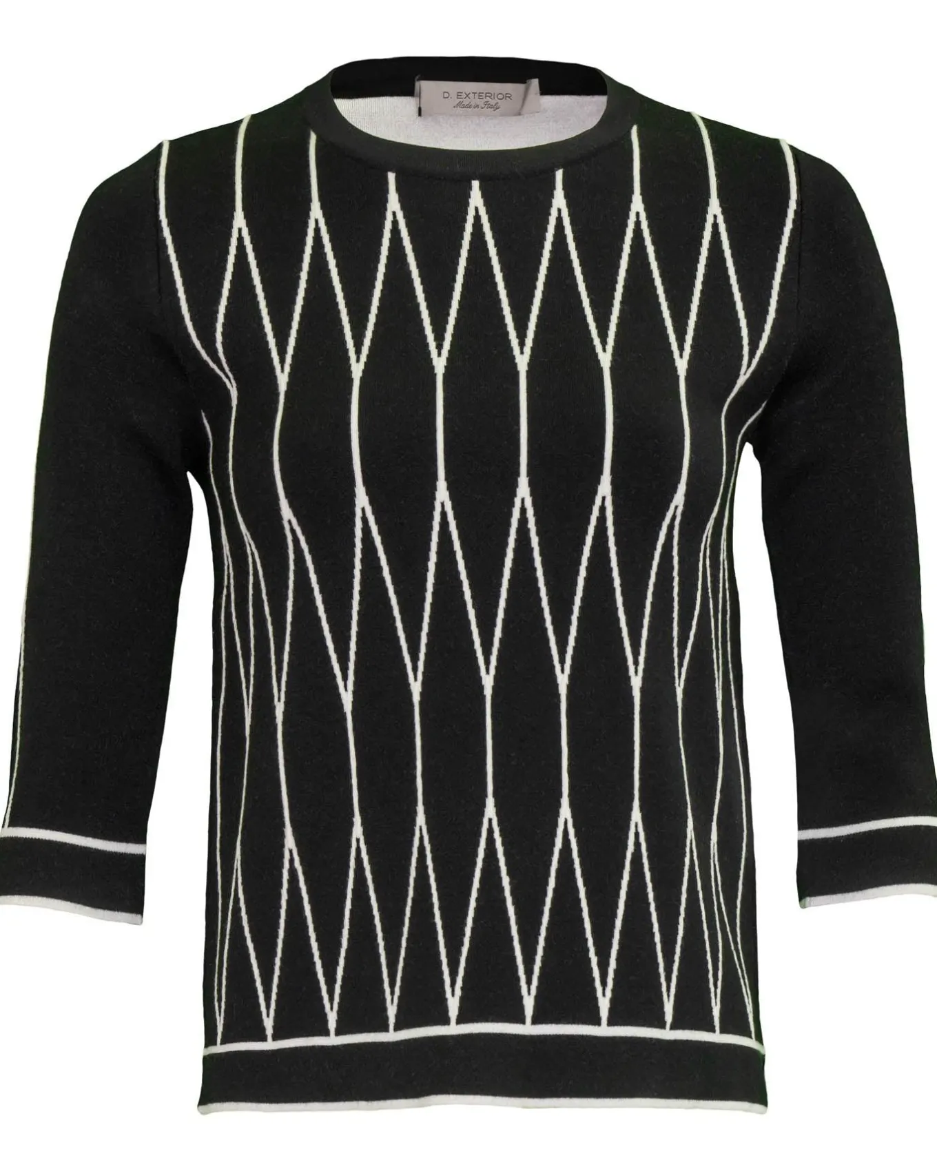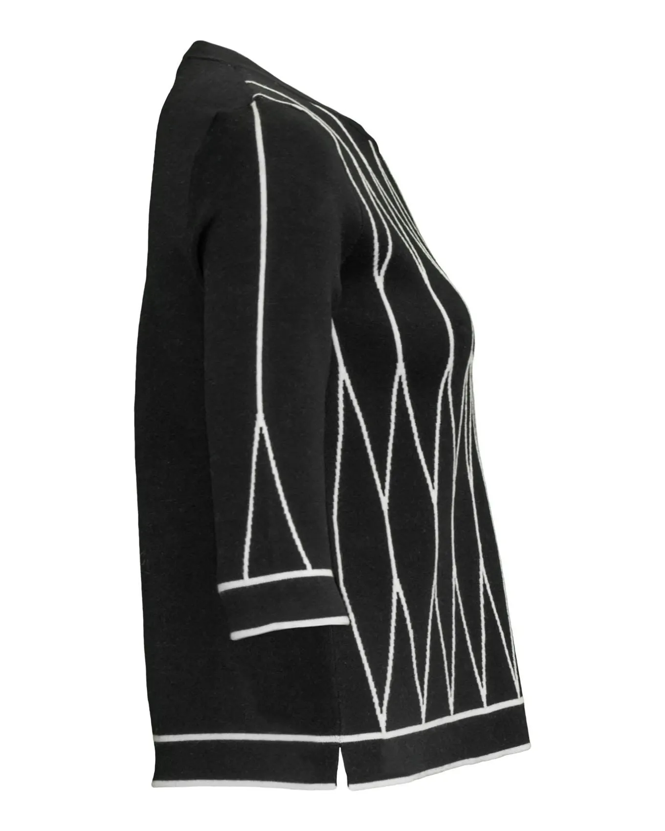 Round neck pull over knit with 3/4 length sleeves and graphic diamond front pattern and matching sleeve detail