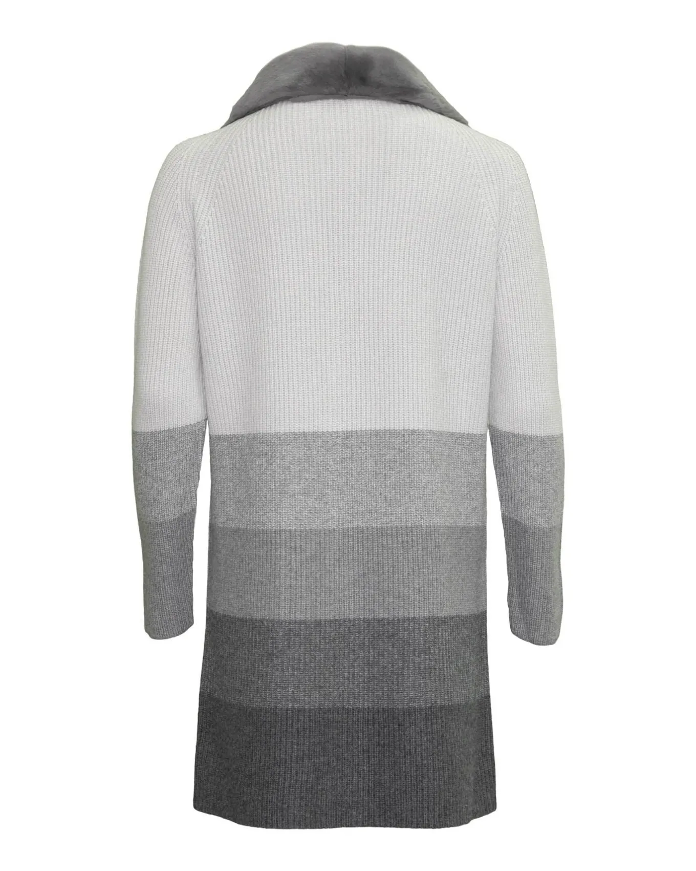Soft long colorblock cardigan with rabbit fur trim on collar, two front pockets, snap button closure and belt