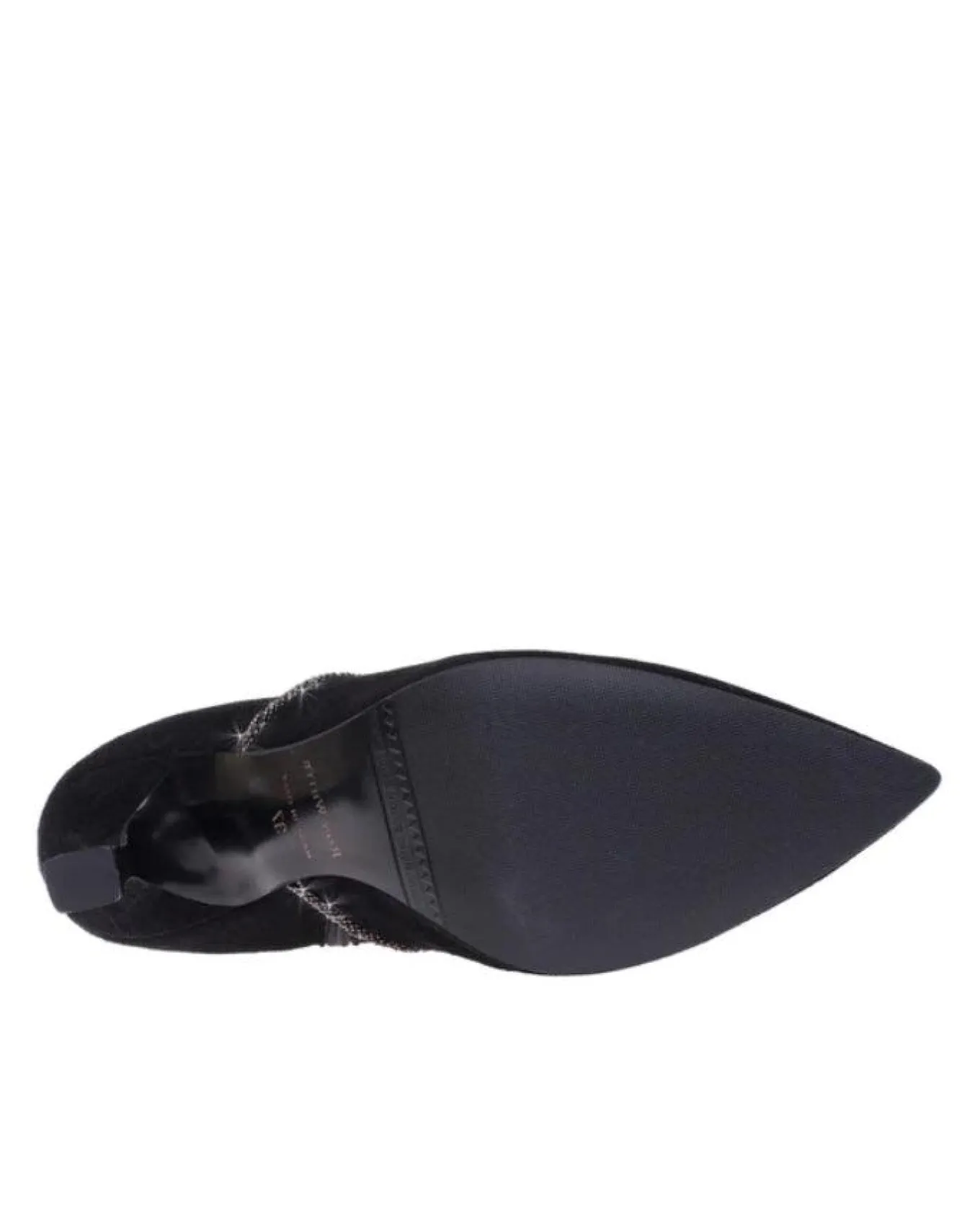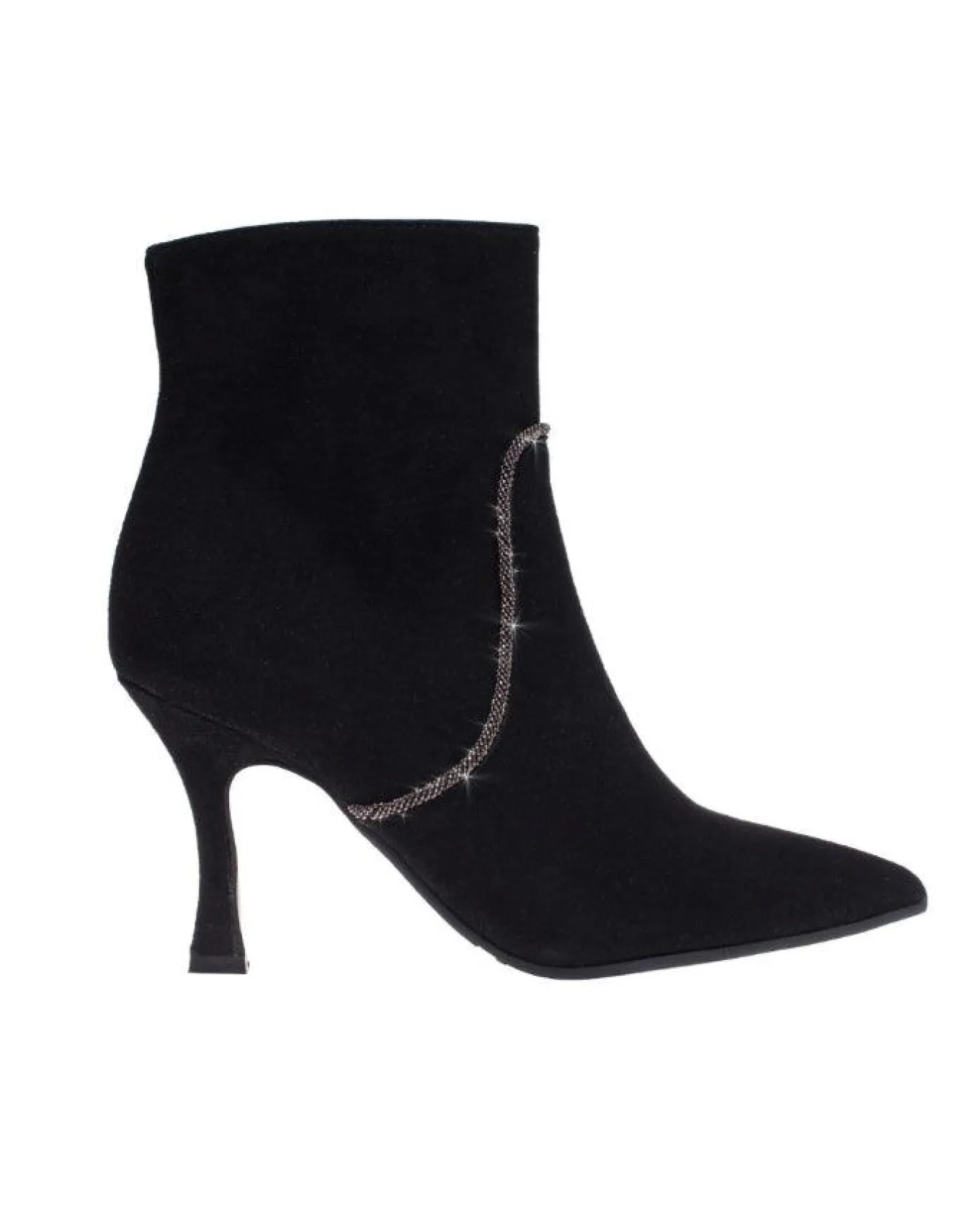 Weatherproof cashmere suede ankle boot with inside zipper, pointed toe, beaded strand detail, 3 1/4″ heel and anti-slip rubber sole