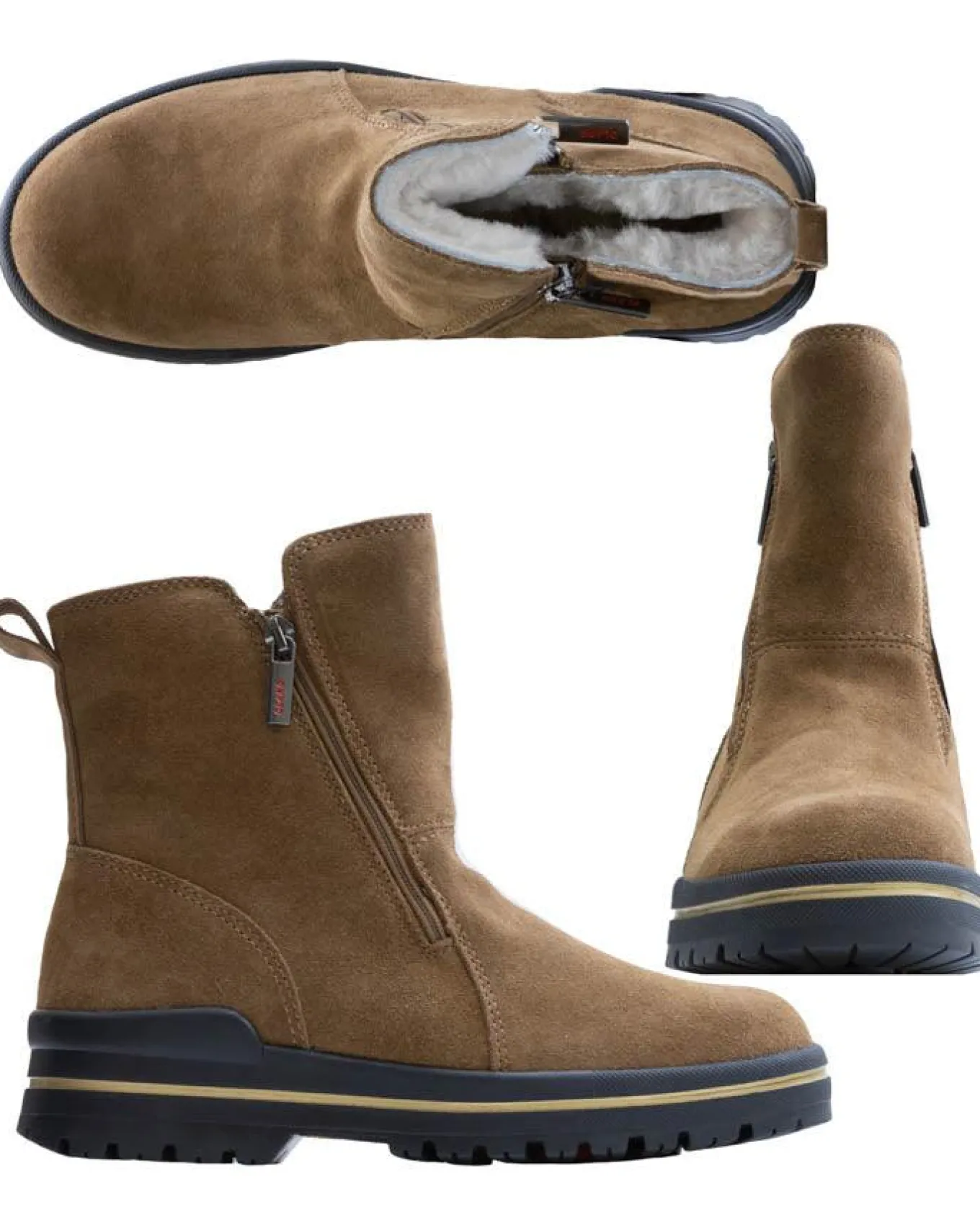 Hydro-suede upper boots with sturdy dual zippers allowing for wider opening, waterproof base, virgin wool lining, additional insole with silver insulating and reflective film, comfort zone up to -30 C, Alaska outsole with grips by OC System, Boot Height 6″