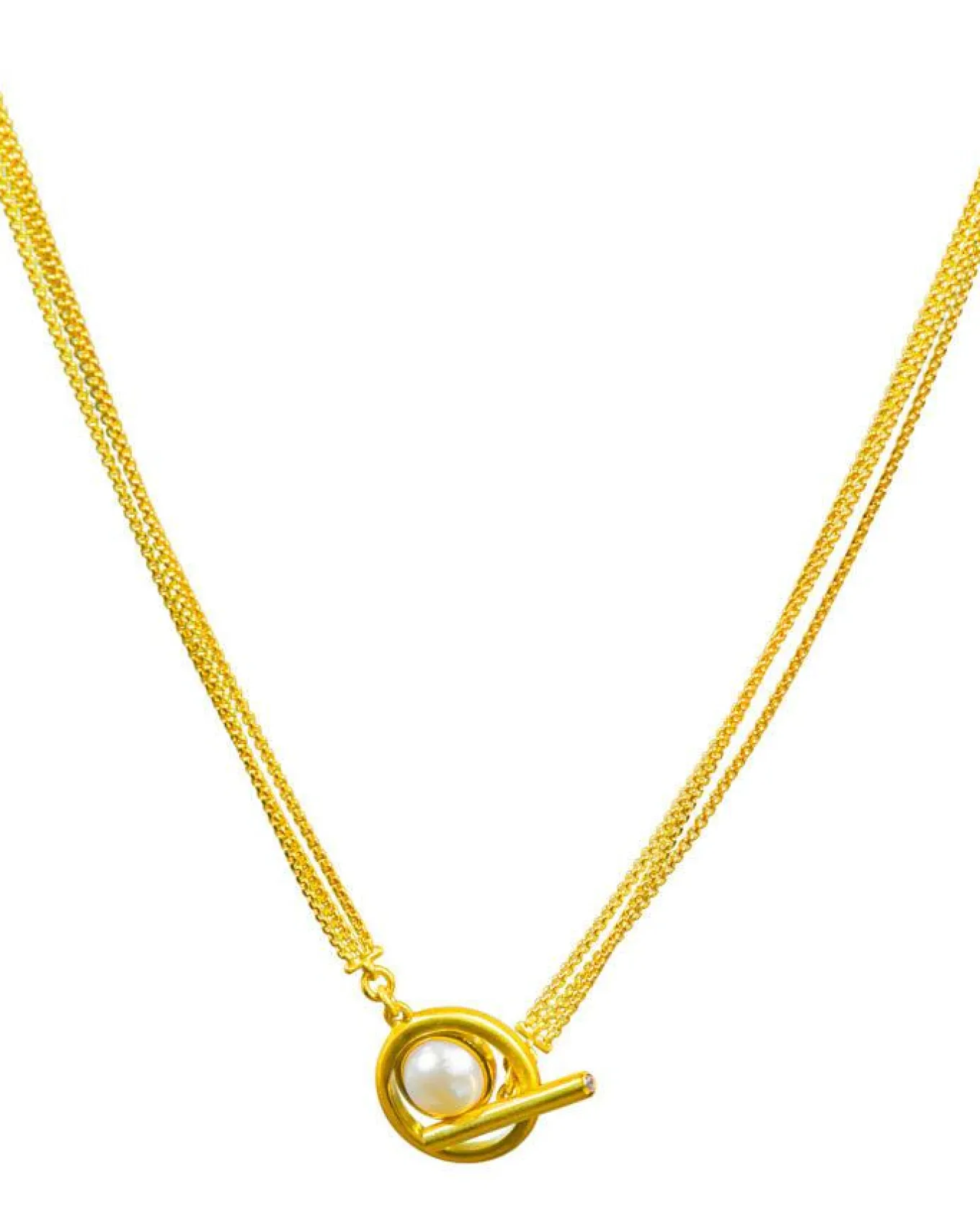 Dean Davidson layered statement pendant necklace features a genuine pearl surrounded by a thin gold outline and suspended on a four strand chain and toggle closure.