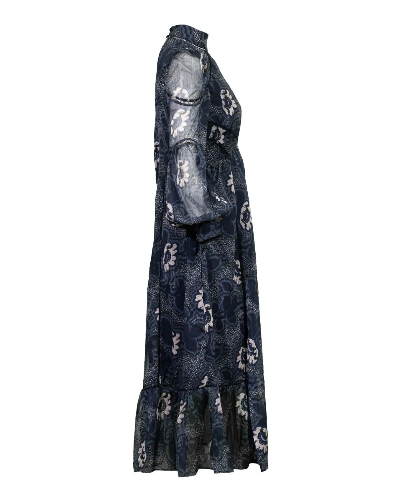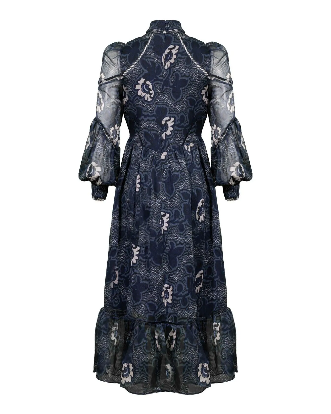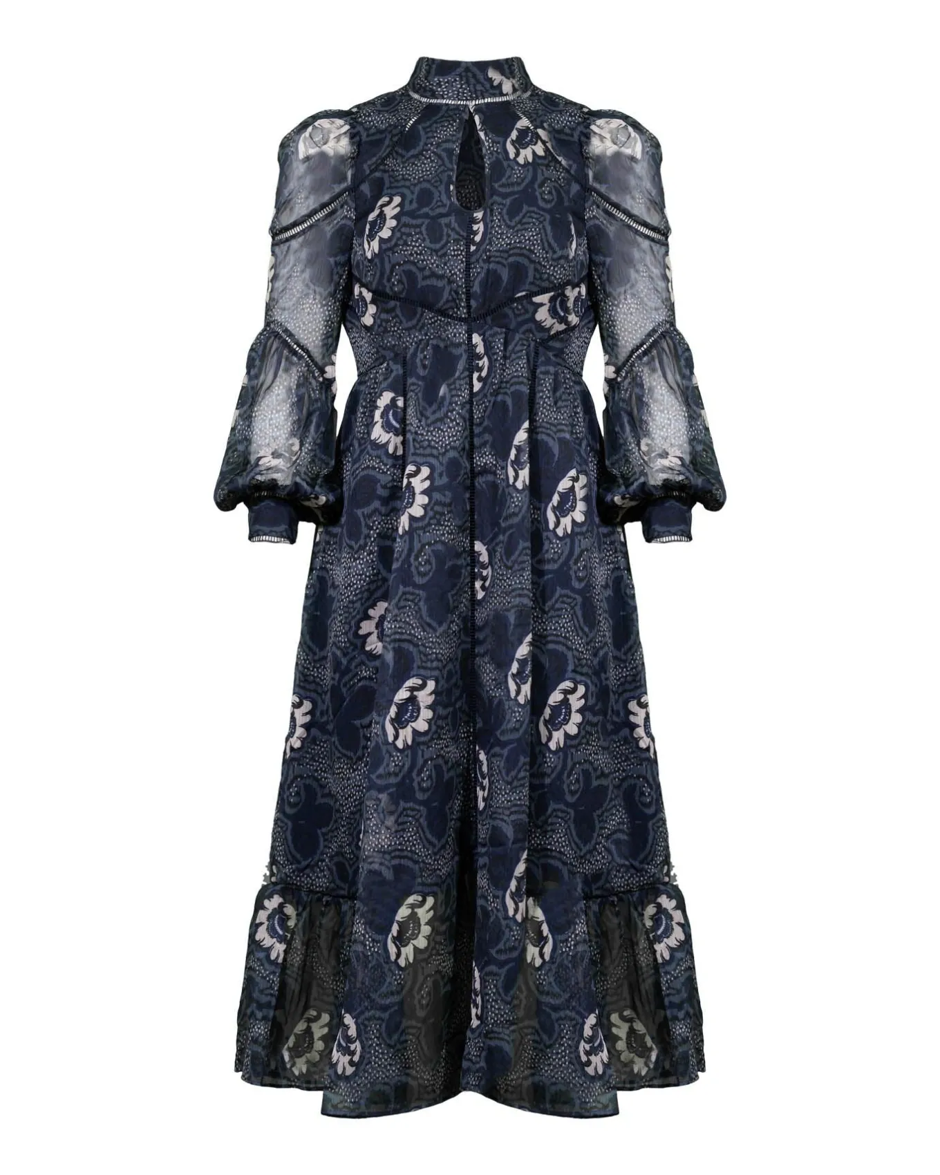 Flowy dotty floral print midi dress with a high cut out neckline with button down closure, sheer bishop puff long sleeves, ladder trim detail inserts, button and zip closure at back and ruffle hem
