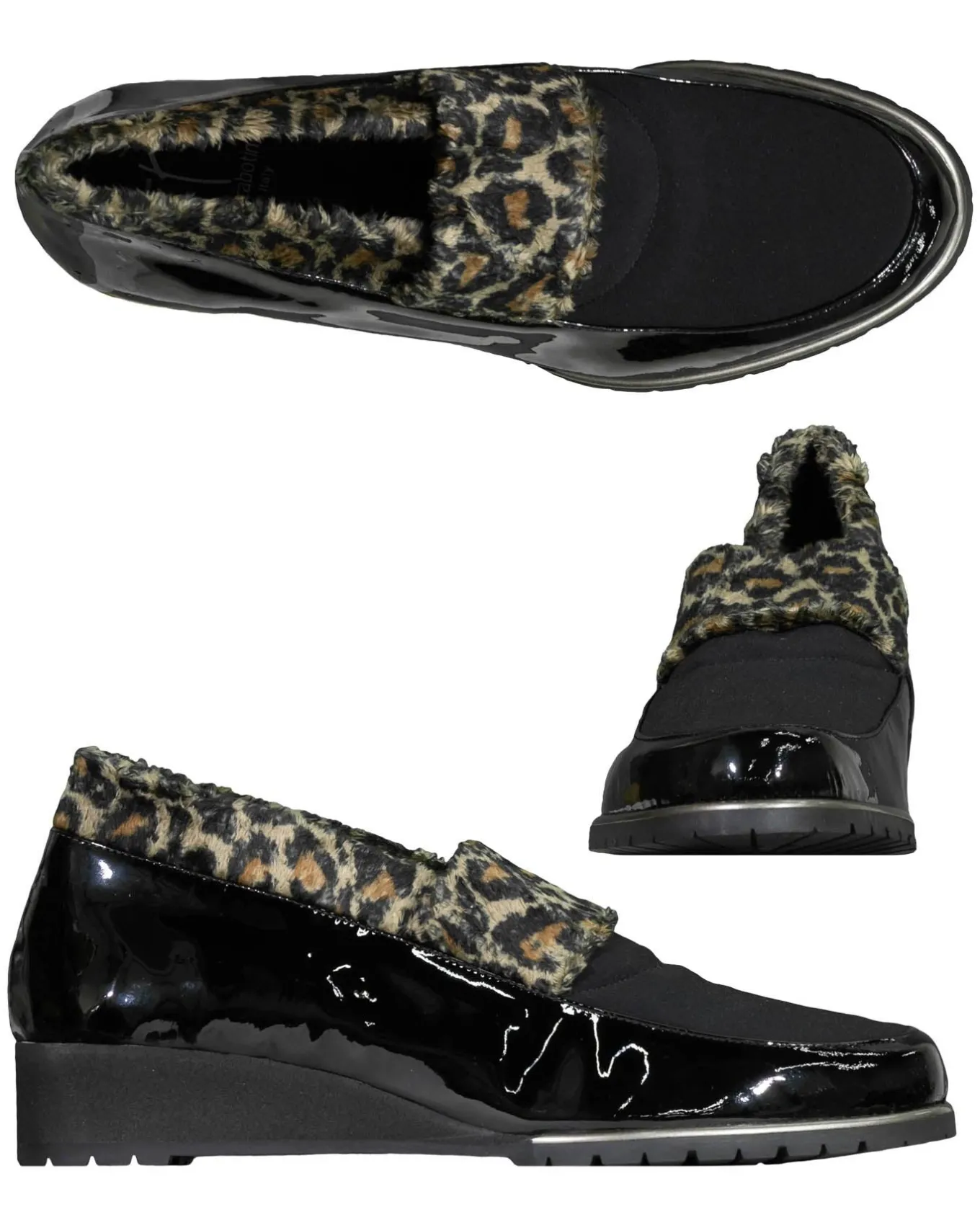 Mixed leather slip on loafer with faux fur trim and wedge heel