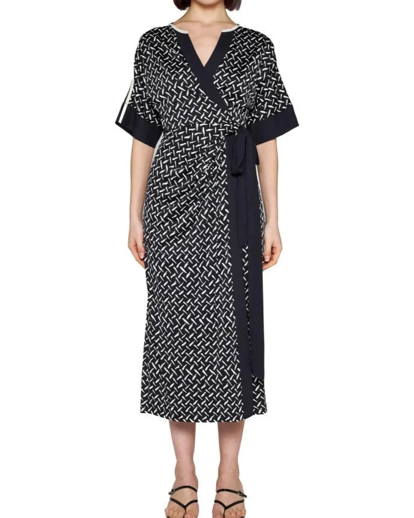Diane Von Furstenber soft cotton jersey blend, the Dorothea wrap dress has a soft, comfortable feel. This piece has relaxed half sleeves, a V-neckline, and waist-defining, true wrap closure. Contrasting trim features throughout and its skirt falls at the midcalf.