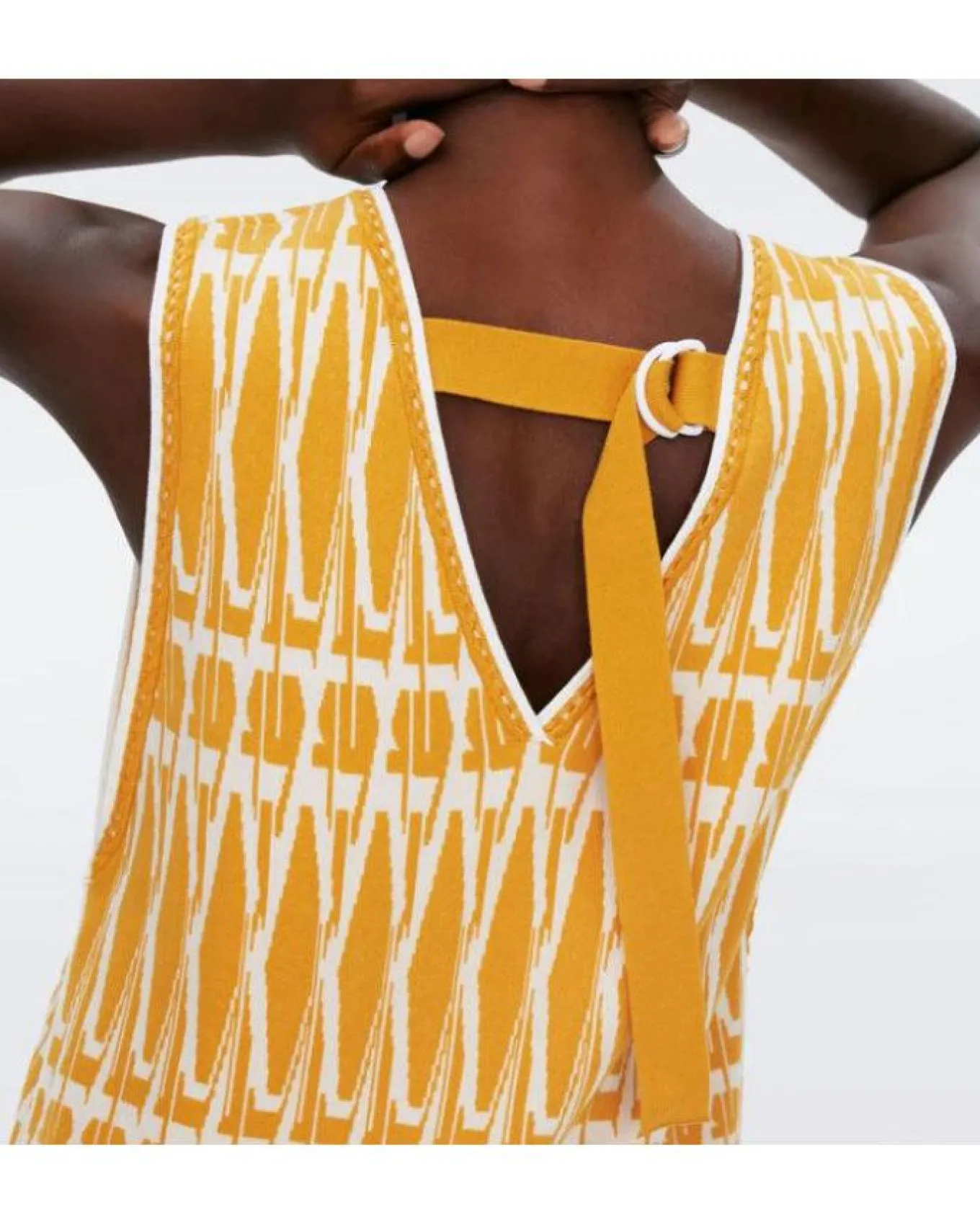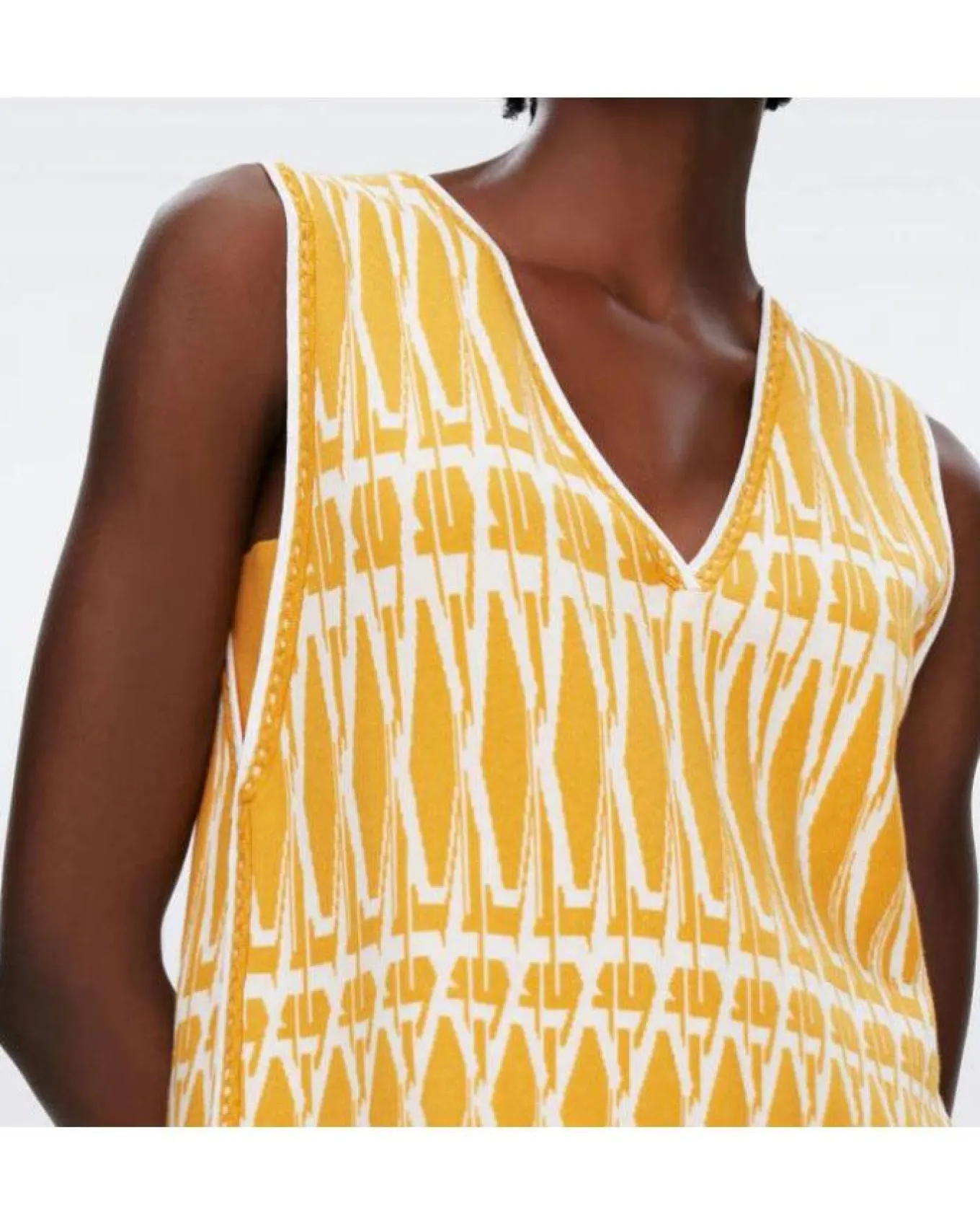 Diane Von Furstenberg knit jacquard dress falls above the knee, is sleeveless with V-neckline, a fringed hem, contrasting detail at the sides, and an easy shape.