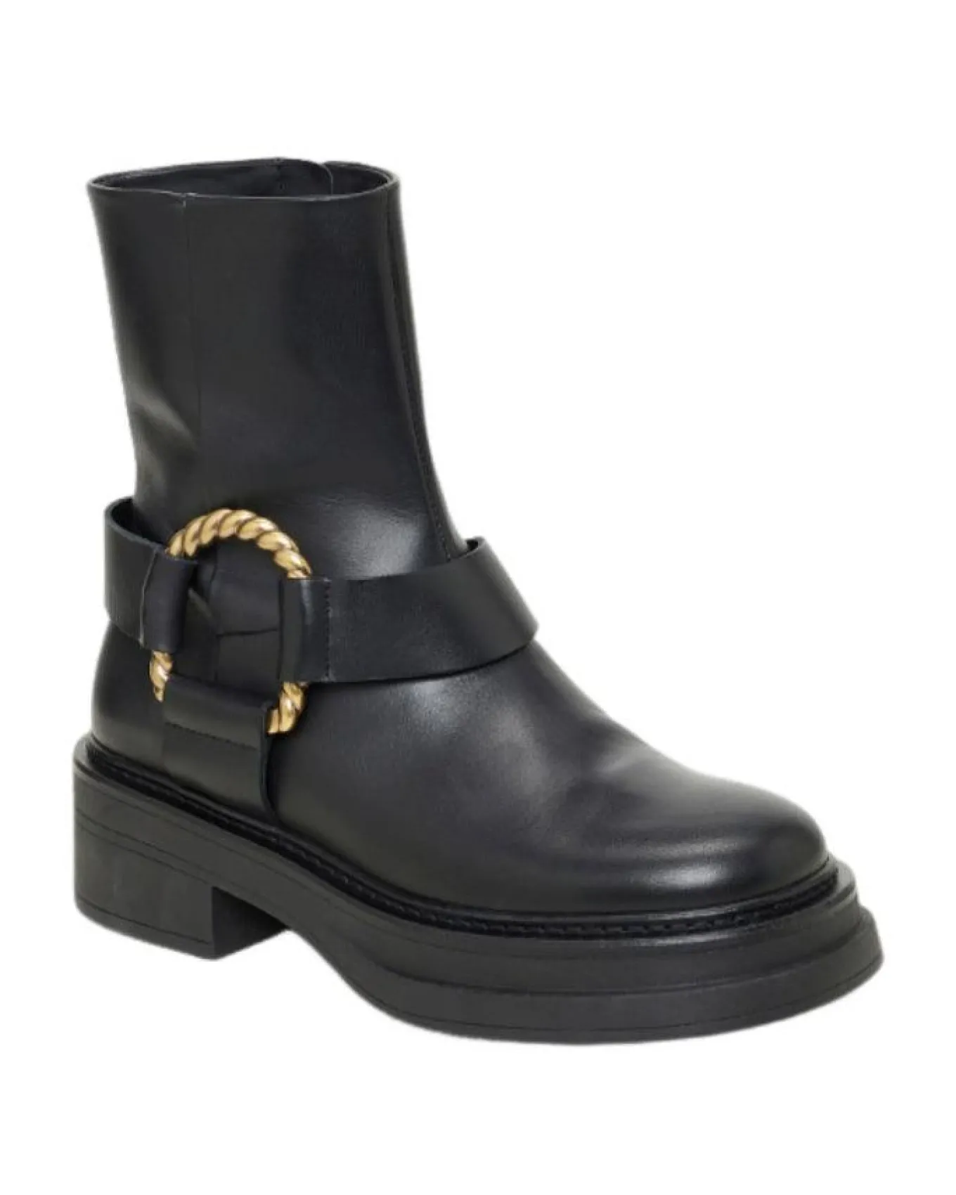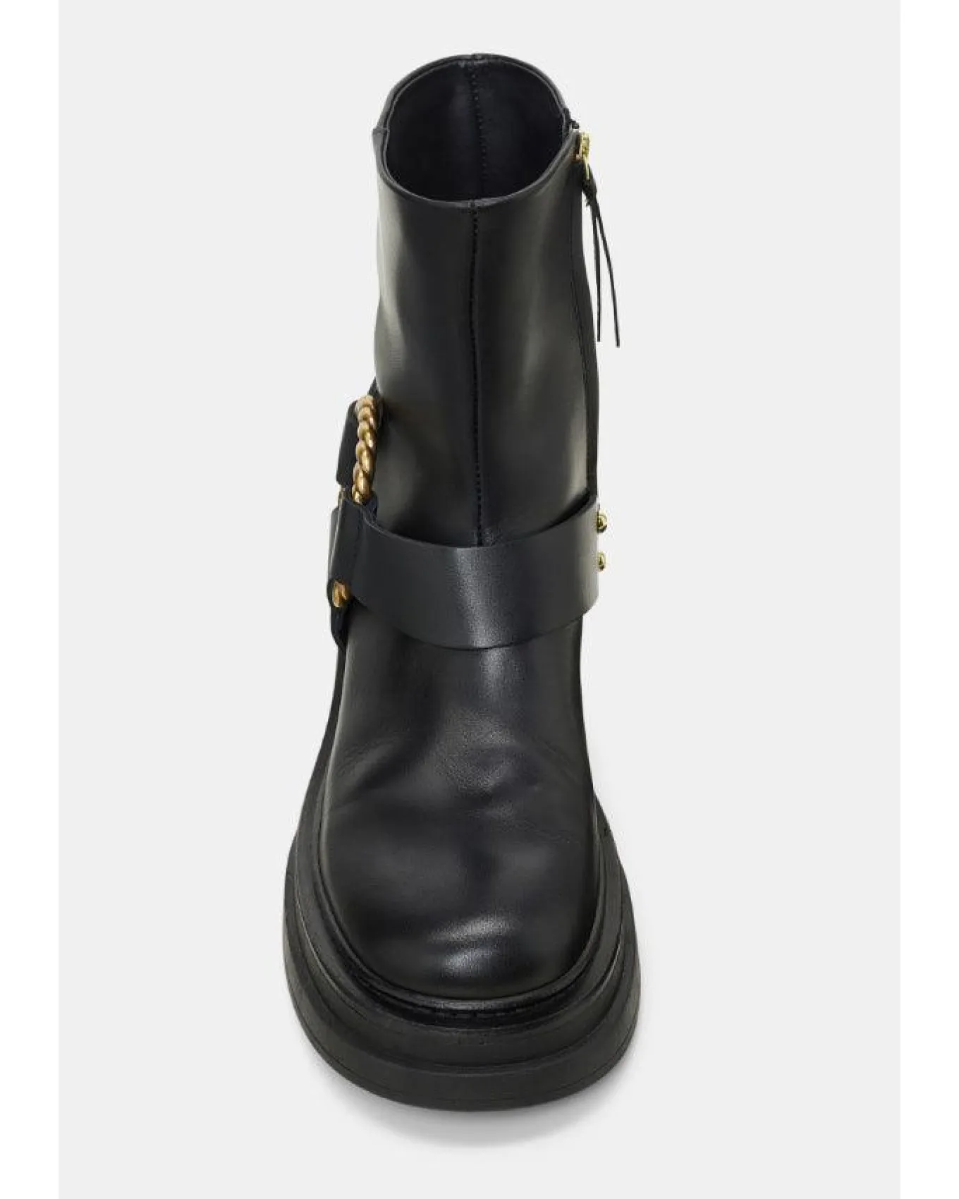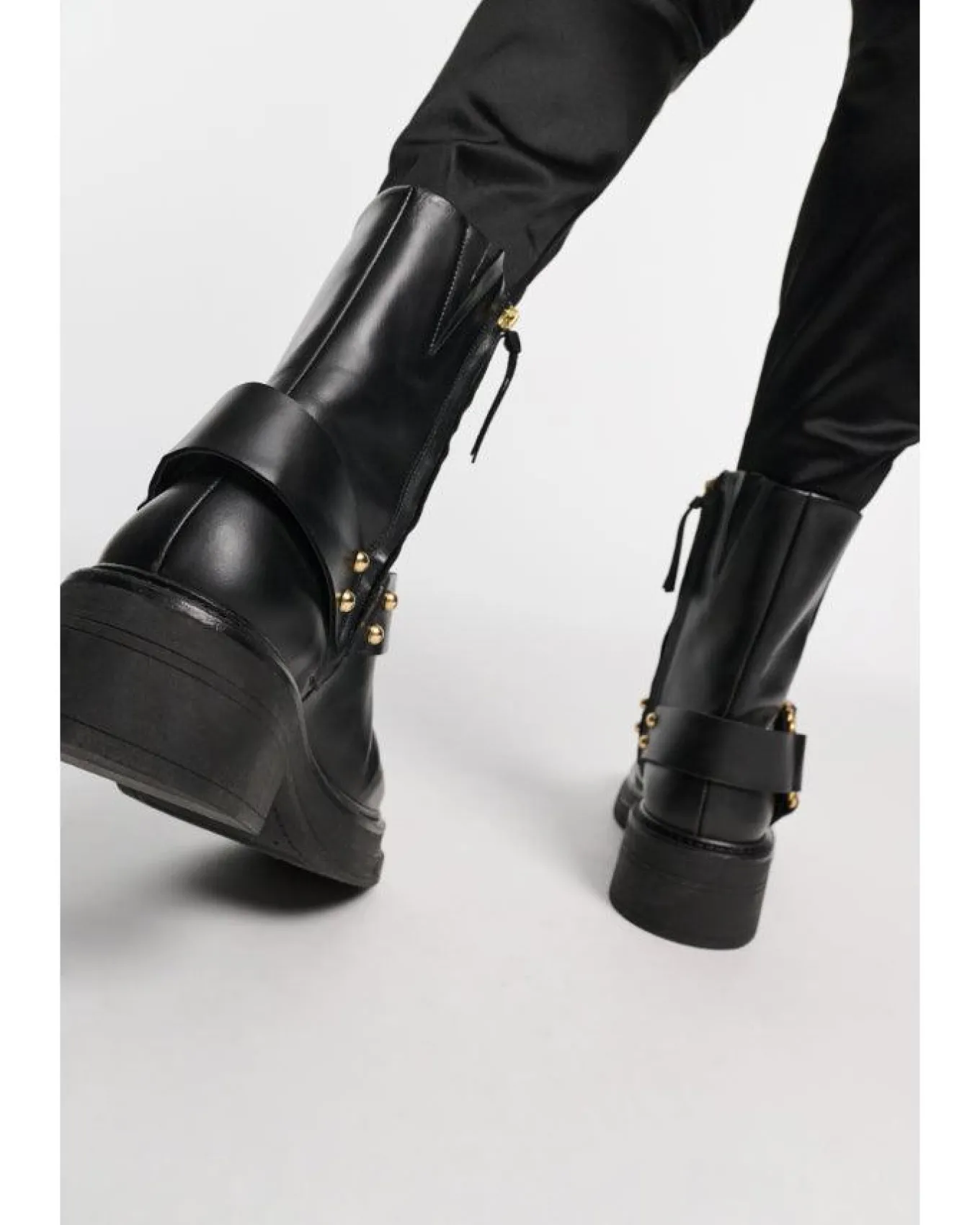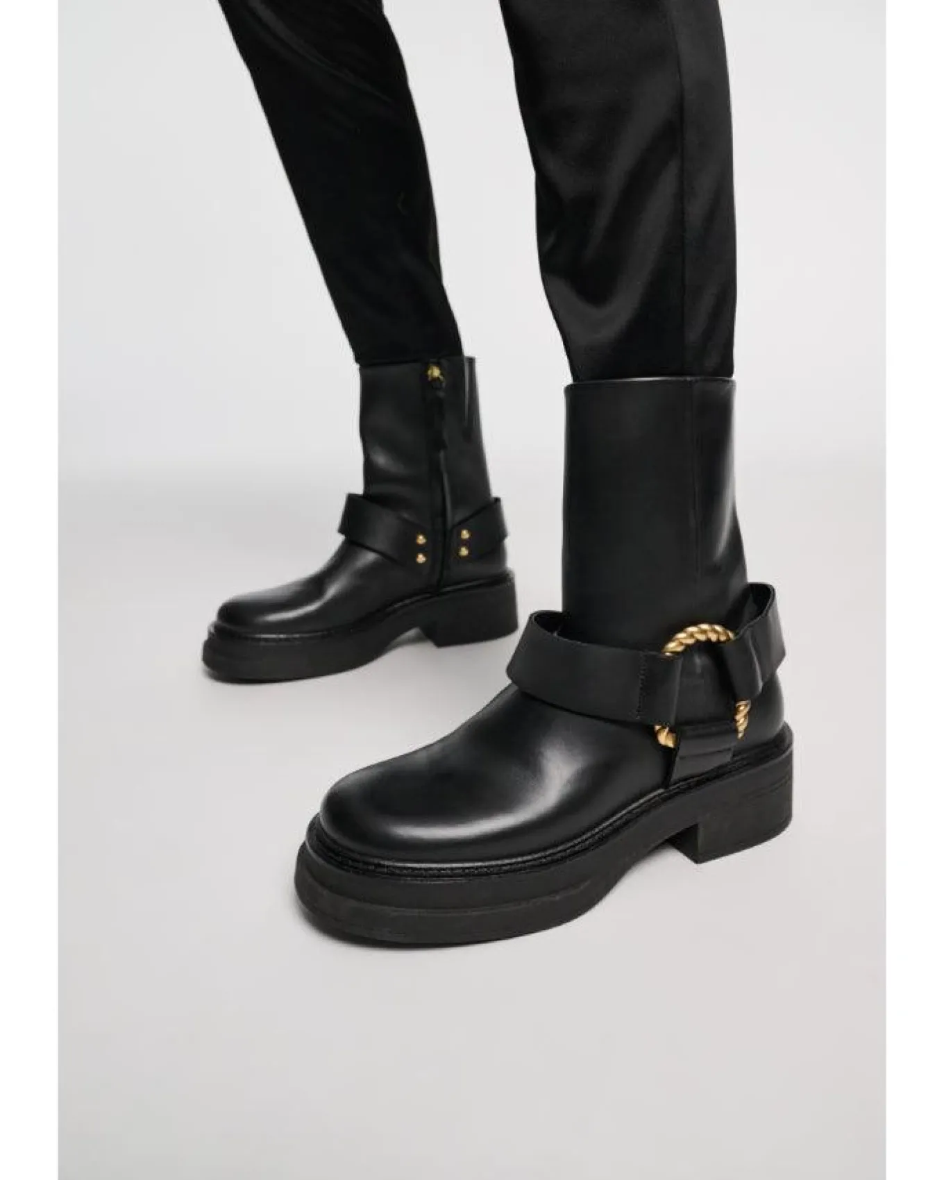 Dorothee Schumacher short calfskin biker boots have a round toe and strap with twisted metal ring detail, studs on the inside straps and leather lining. The chunky style has a rubber sole and inside zip closure.