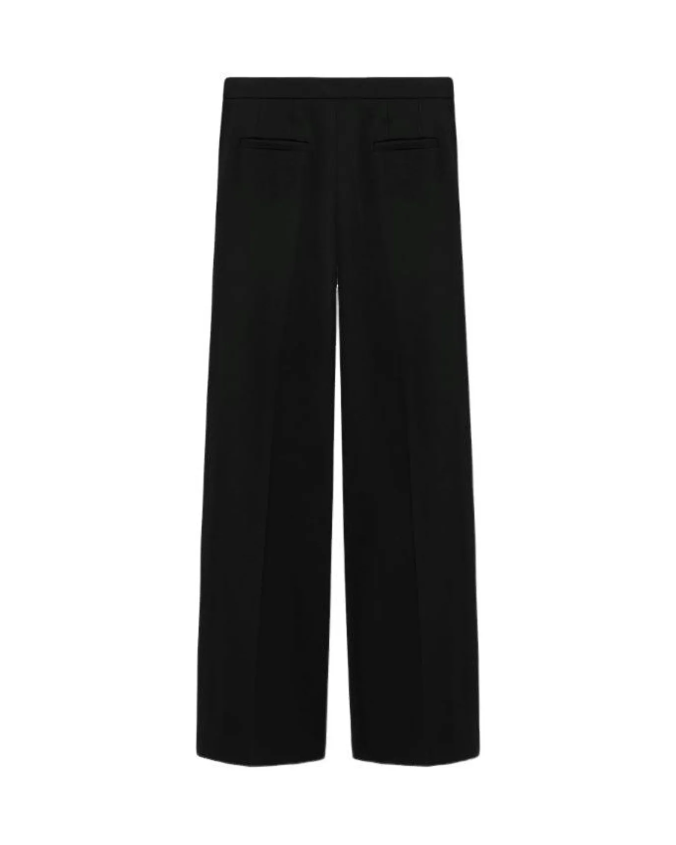 Dorothee Schumacher wide leg punto milano sailor pants with decorative gold-tone front buttons, pressed pleats, back welt pockets and side zip closure.