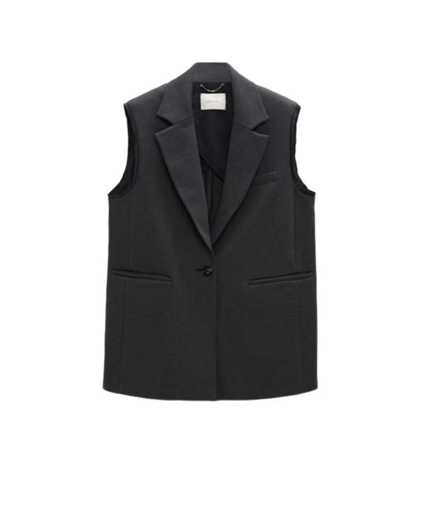 Oversized fit, soft punto milano suiting vest with draped lapel collar,single breasted with button, flap pockets, welt breast pocket, embellished with satin detail in armholes.