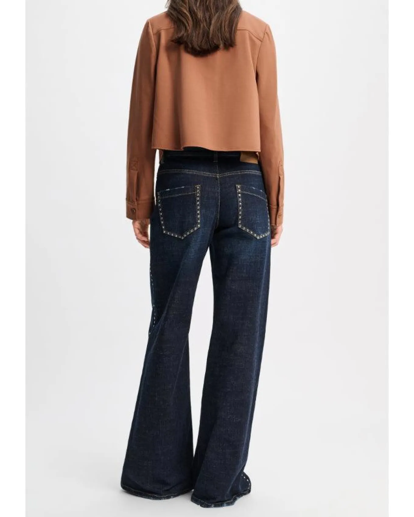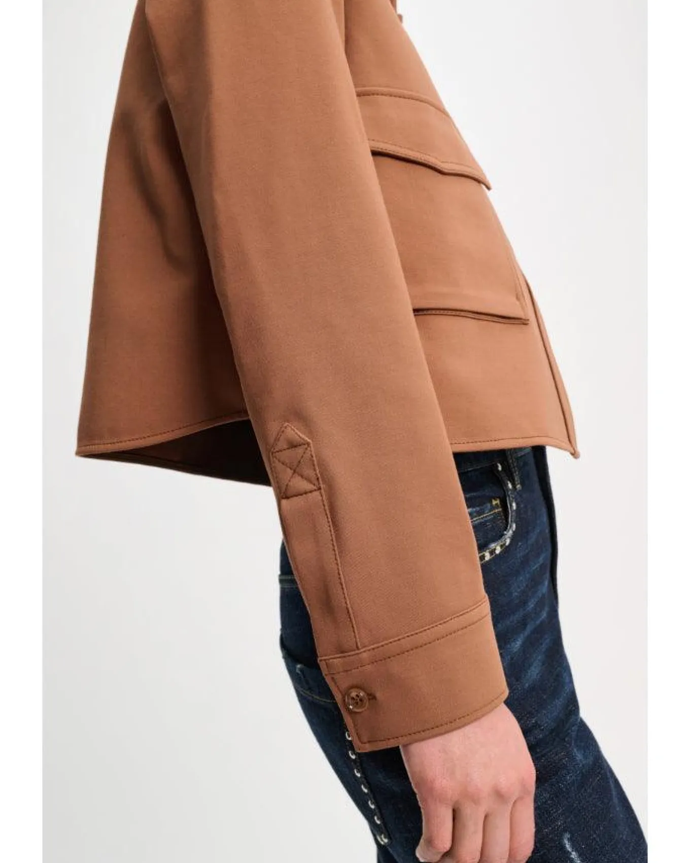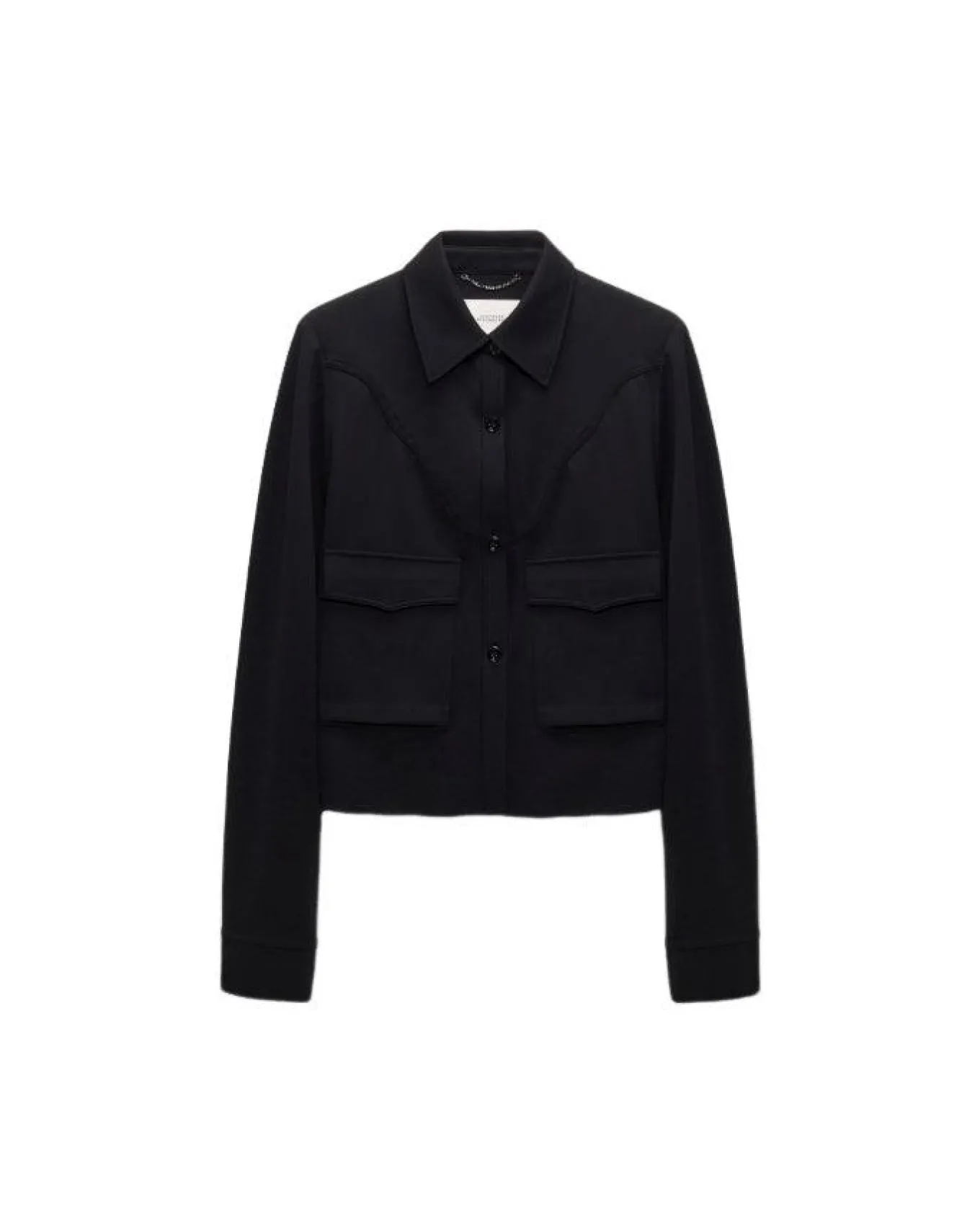 Dorothee Schumacher shirt-jacket hybrid is made from Punto Milano and has Western-inspired patterning on the front. The shirt-jacket is croppedwith classic collar, button front closure, flap pockets, button cuffs, back yoke and is unlined.