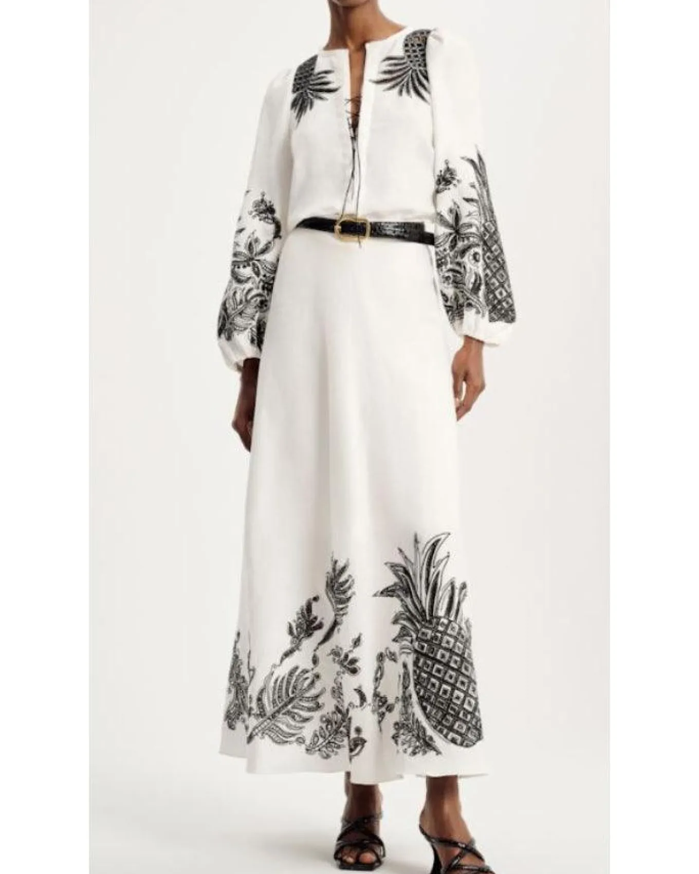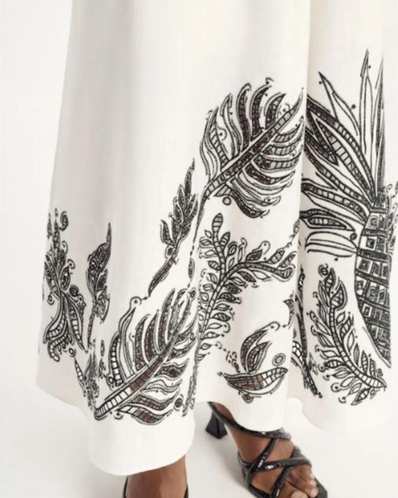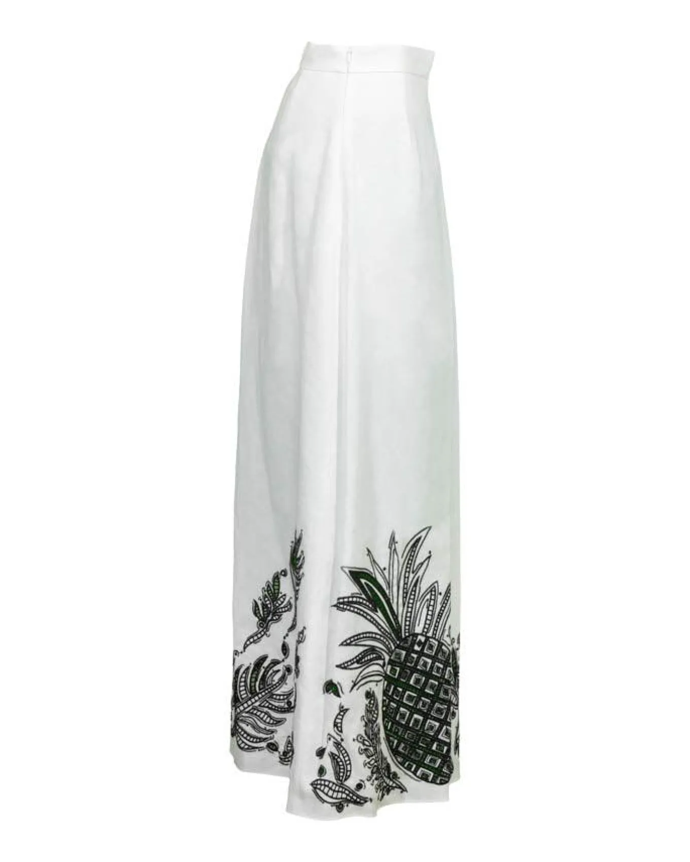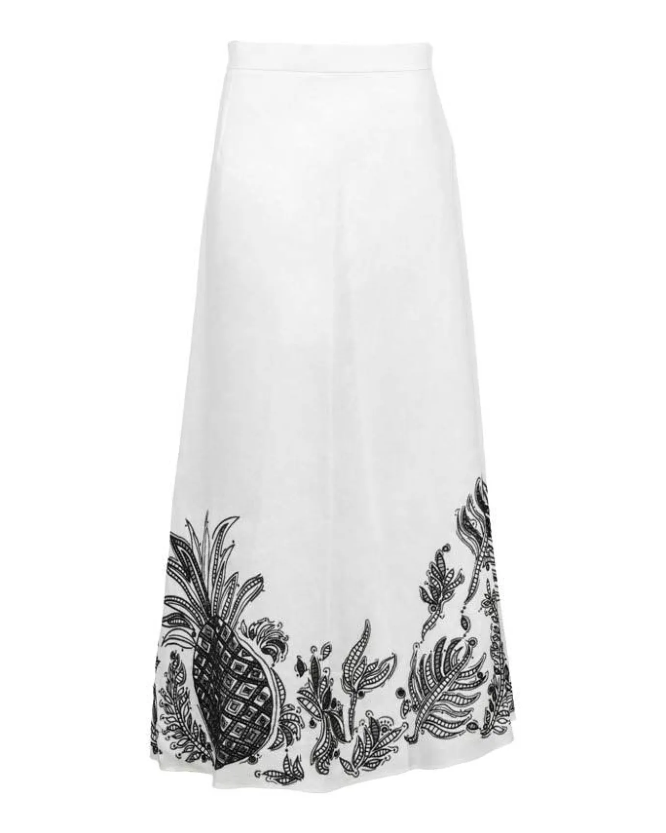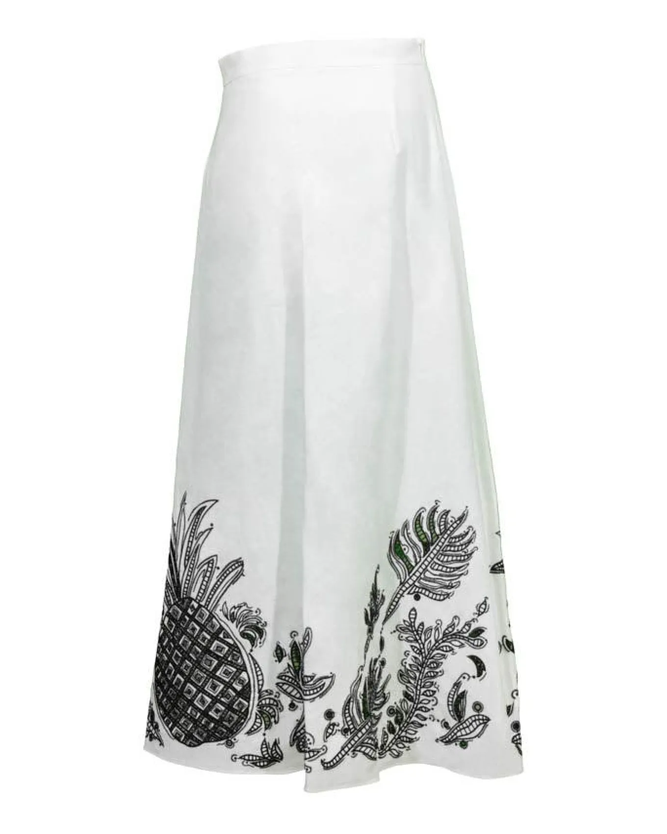 Dorothee Schumacher fitted linen midi skirt has contrast broderie anglaise patterning and a slightly shorter draped front. In-seam back zip closure.