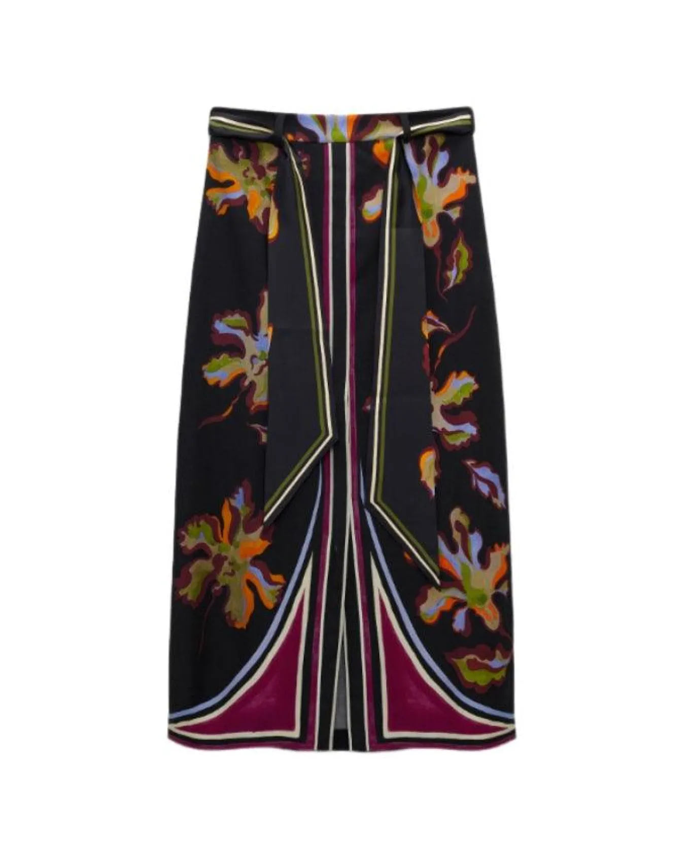 Dorothee Schumacher artfully placed printed silk twill midi skirt with a center front slit button placket has a flowy, slim fit, scarf tie belt and side zip closure.