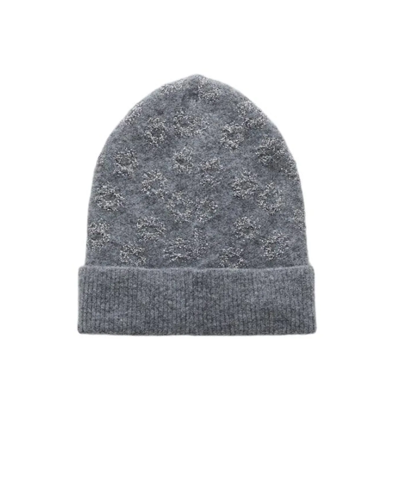 Soft alpaca blend knit hat with shiny, lurex floral details and ribbed turn up rim.