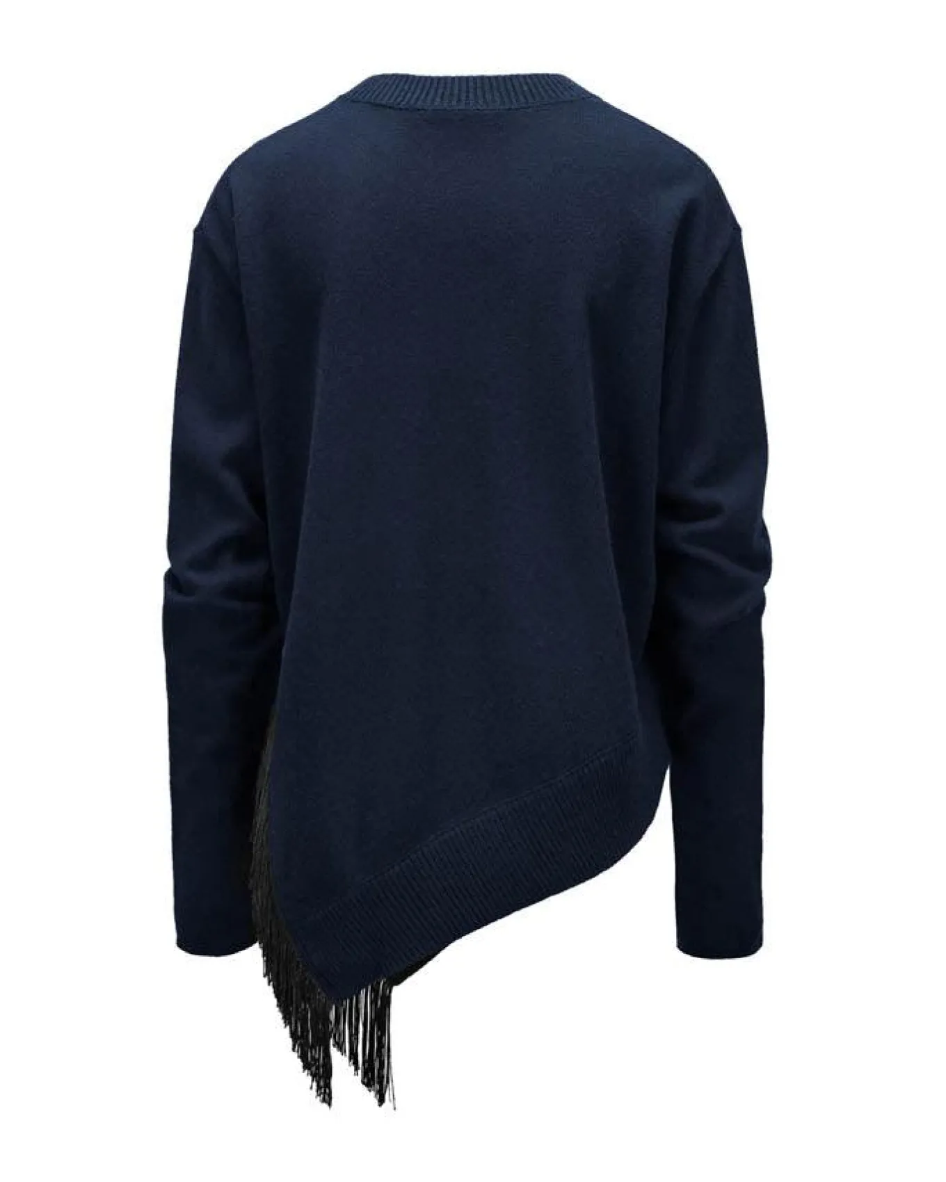 Dorothee Schumacher relaxed fit, wool cashmere knit pullover with crew neck, asymmetric hemline with fringe and extra long sleeves.