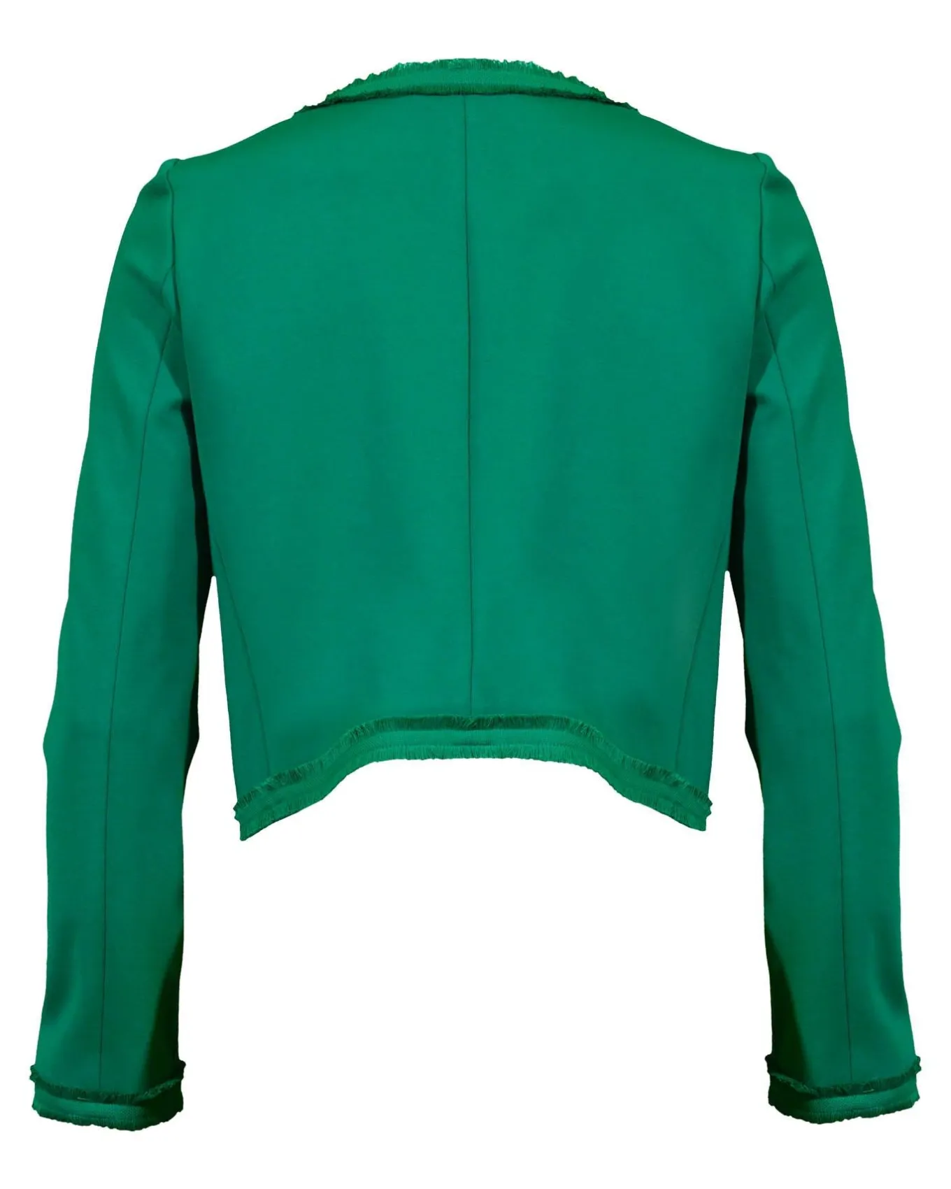 Slim open front straight silhouette jacket features four front patch pockets with fringe trims, entire jacket finished with fringe trim, Size 2: Front Length 54 cm, Back Length 40 cm, Sleeve Length 60 cm