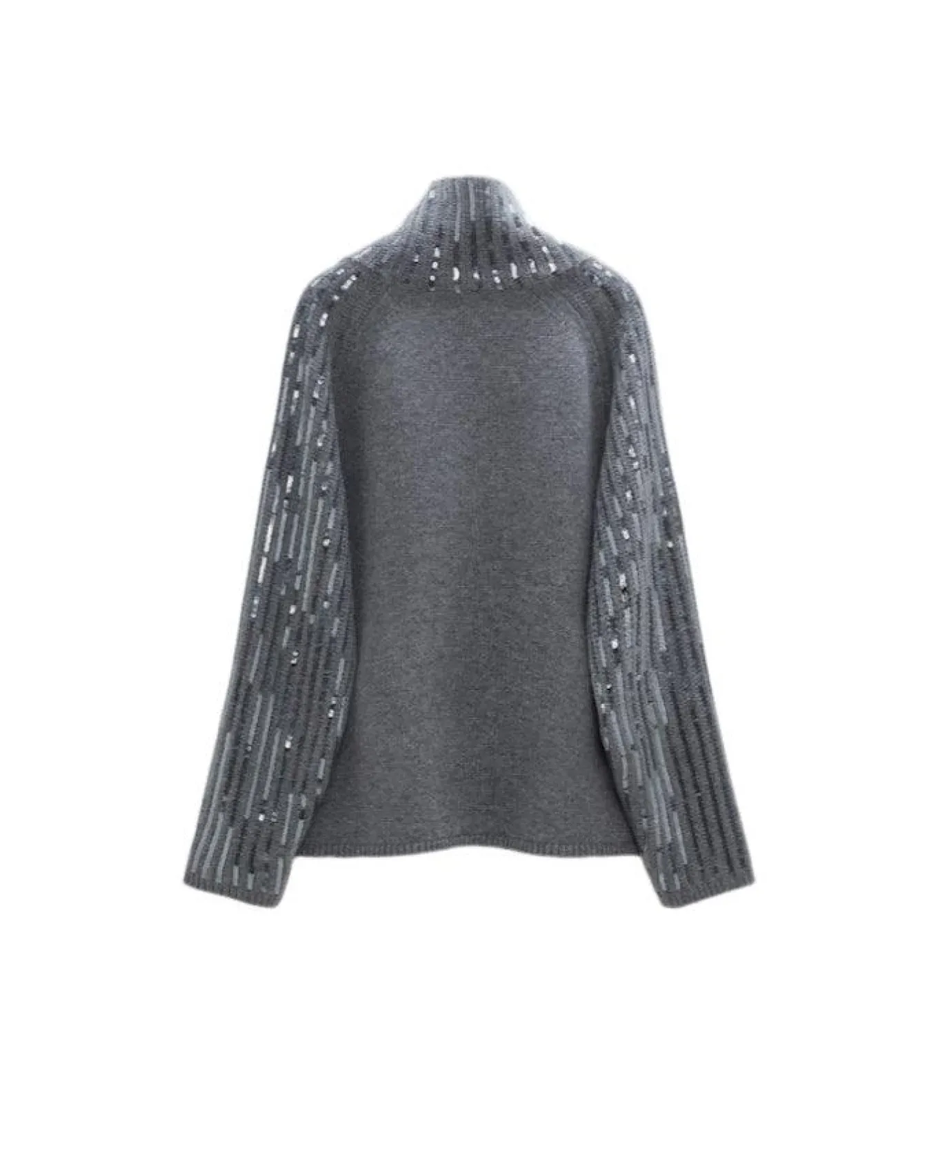 Relaxed fit incredibly soft wool, cashmere turtleneck pullover embellished with rows of sequins, raglan sleeves and small ribbed trims.
