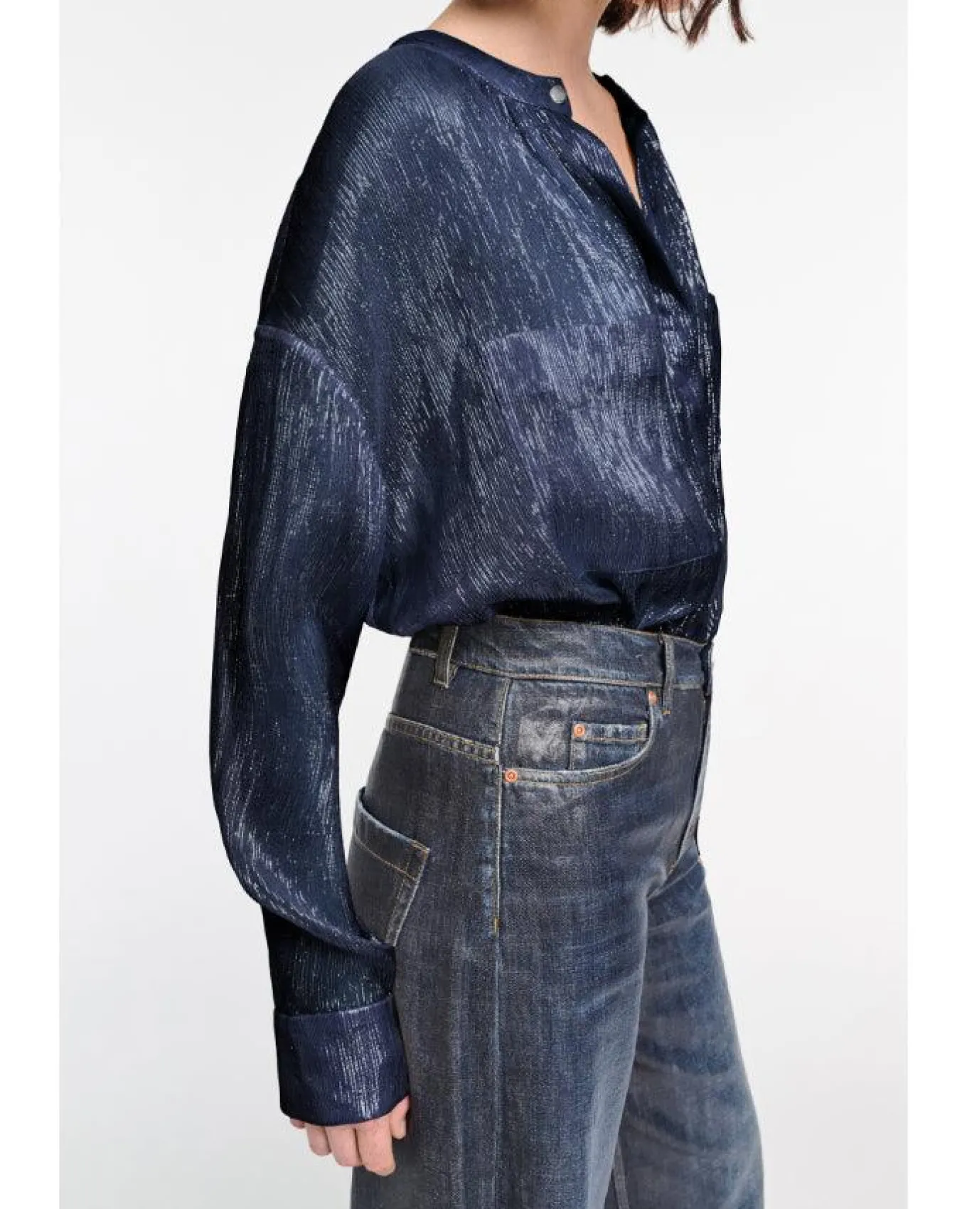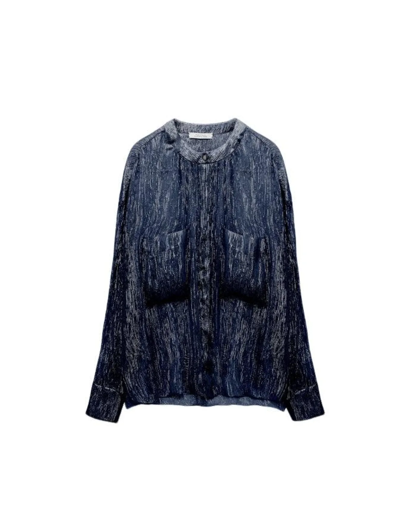 Dorothee Schumacher oversized, boxy silk lame chiffon blouse with large patch pockets, soft gathering at the neckline, decorative snaps and drop shoulders.