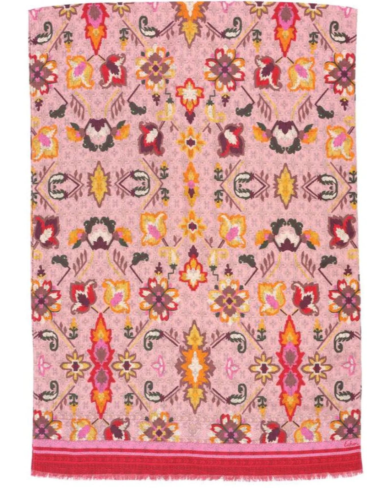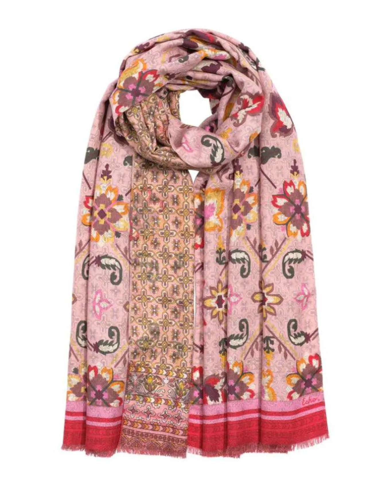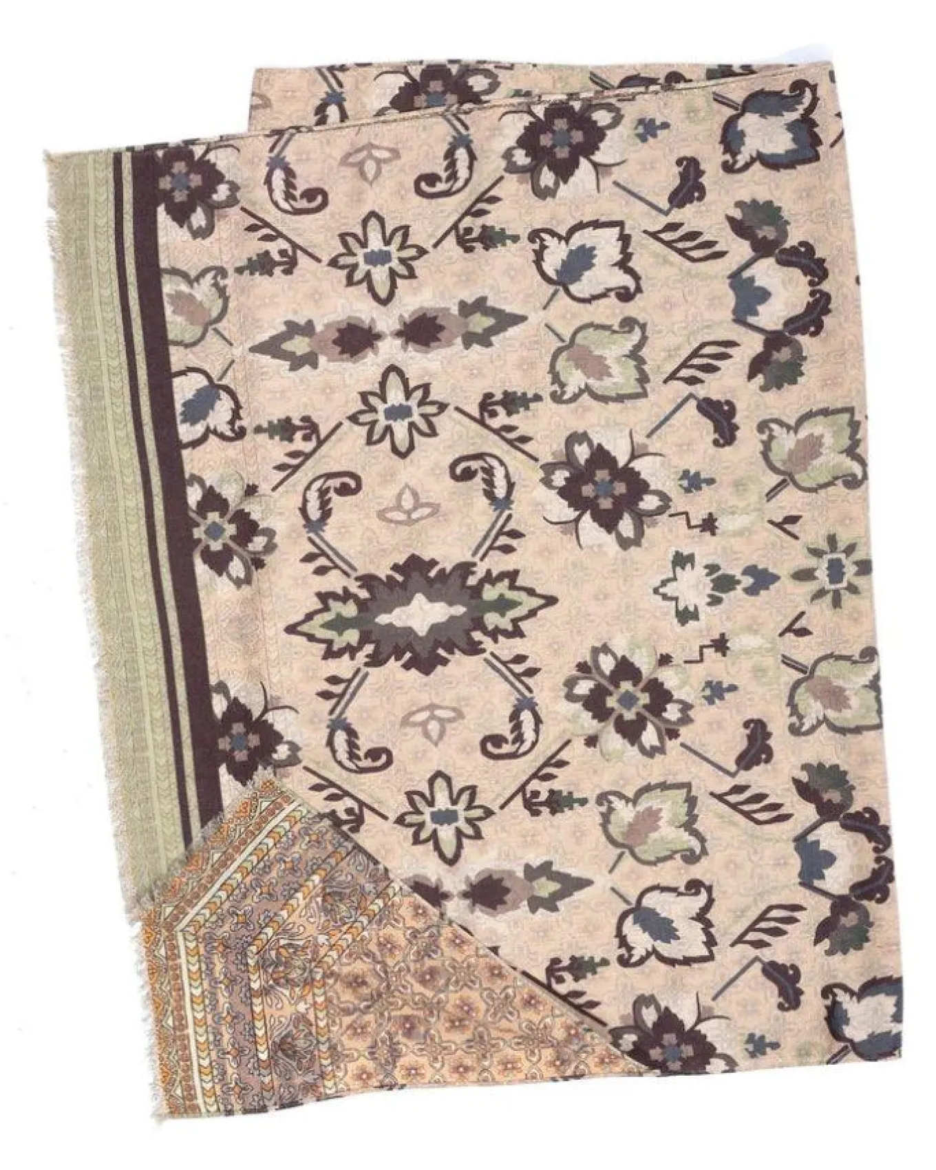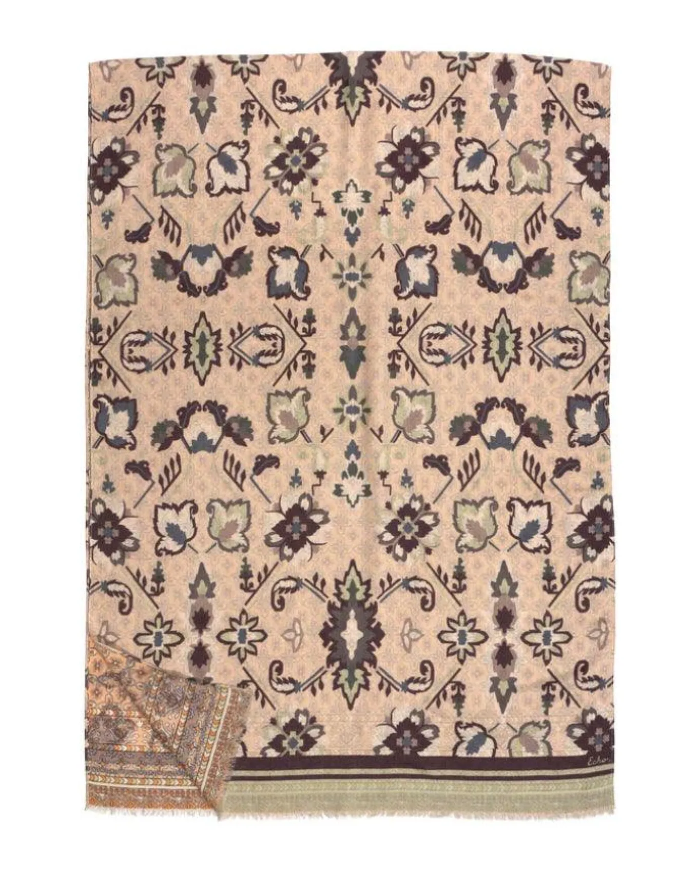 Echo elegant tapestry print wool blend scarf designed to be wrapped, draped, or tied with its 2 in 1 contrast prints on front and back, fringed ends, Dimensions; 27″ x 72″.