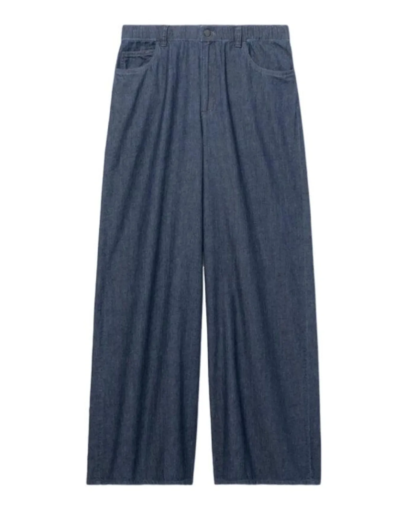 Eileen Fisher relaxed cotton twill wide leg pants are slim through the hips, wider through the leg, 1 1/2″ elastic waistband with button and zip closure, 5-pocket styling, Size S – Rise 11″, Inseam 30″, Leg Opening 13″.