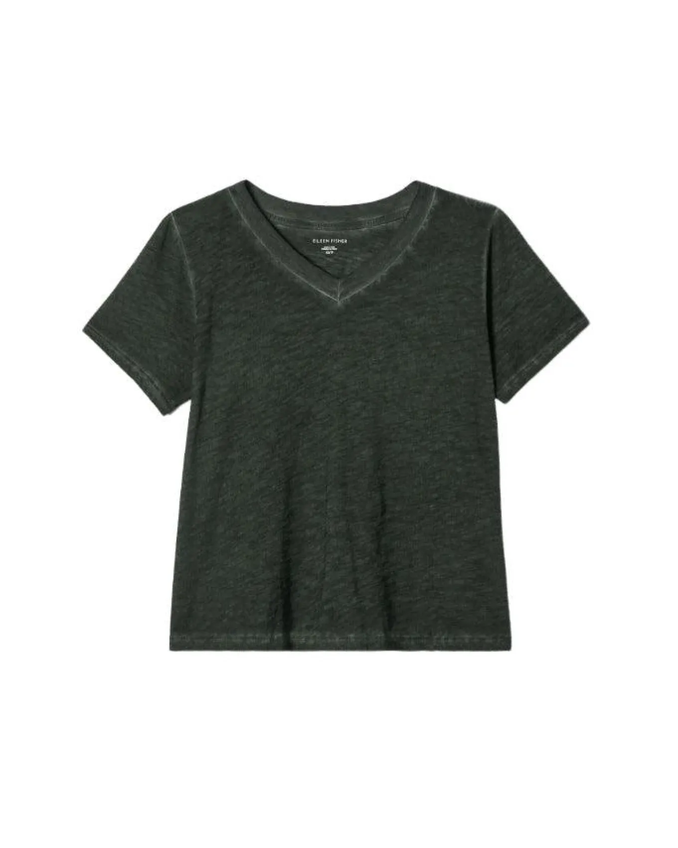 Eileen Fisher vintage inspired look cotton short sleeve,v-neck tee with subtle fading is close at shoulders, wider at hem fits body with ease, Size S – Length 23″.