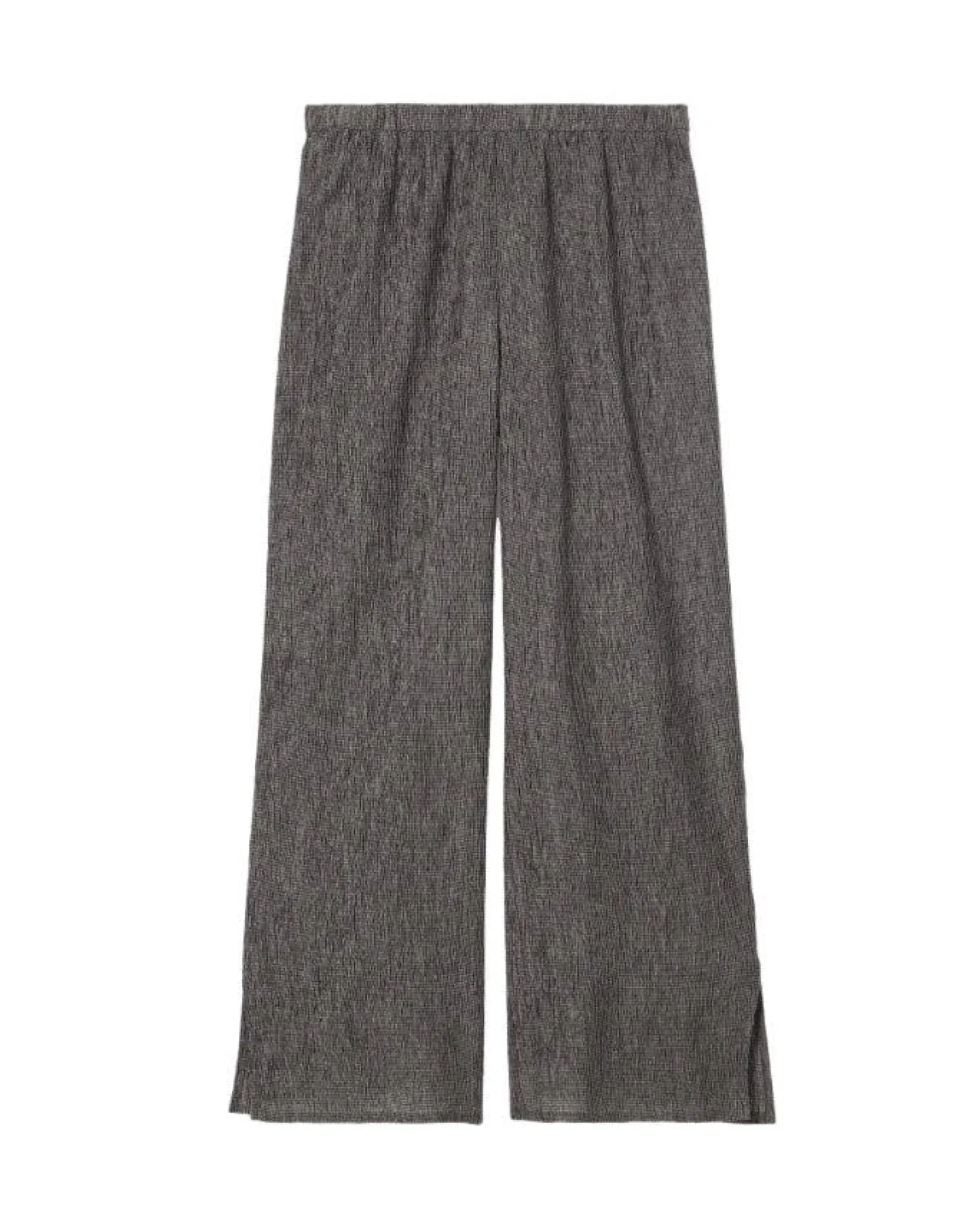 Eileen Fisher plisse pull on ankle pants are slim through the hips with wide legs and 6″ side slits at hem, 1″ elastic waistband, Size XS – Rise 10 1/2″, Inseam 27 1/2″, Leg Opening 12″.