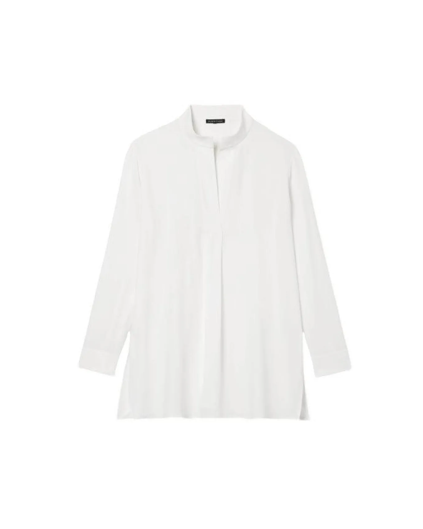 Eileen Fisher long line silhouette silk crepe stand collar tunic with 9 1/2″ front placket, button cuffs with double pleat. inverted pleat at center back and 9″ side slits, Size XS – Length 30 1/2″.