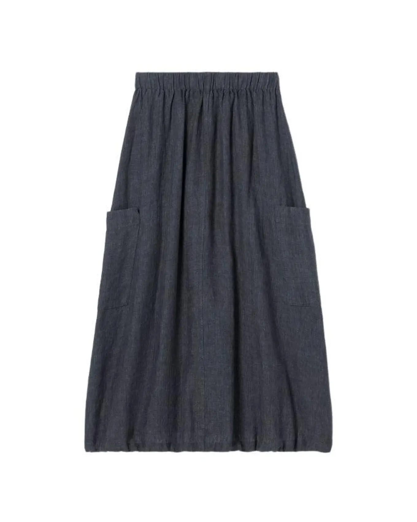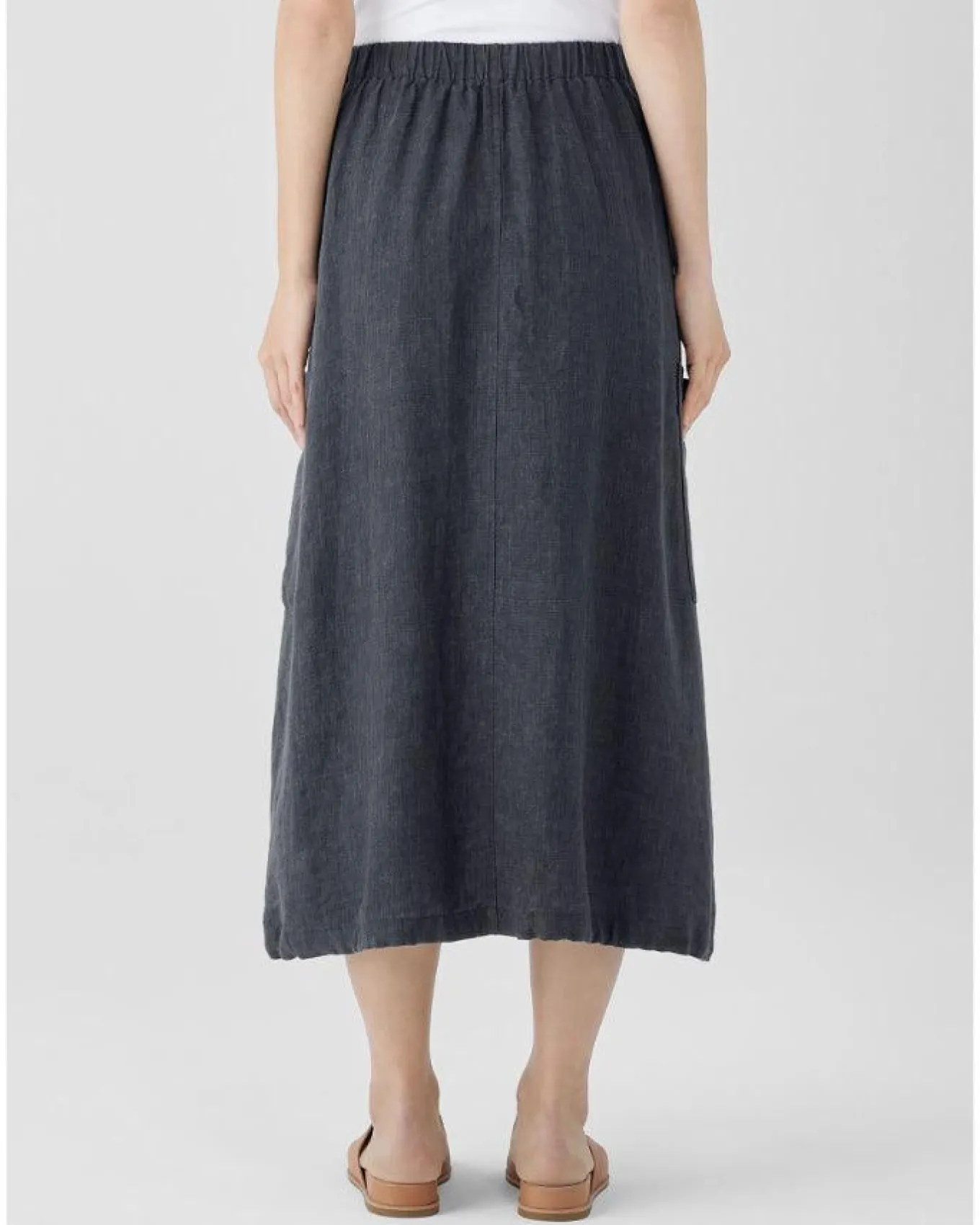 Eileen Fisher linen weave A-line skirt with cargo pockets, 1 1/2″ elastic waistband, centre front and back seam and adjustable drawstring hem, Size XS – Length 32 1/2″.