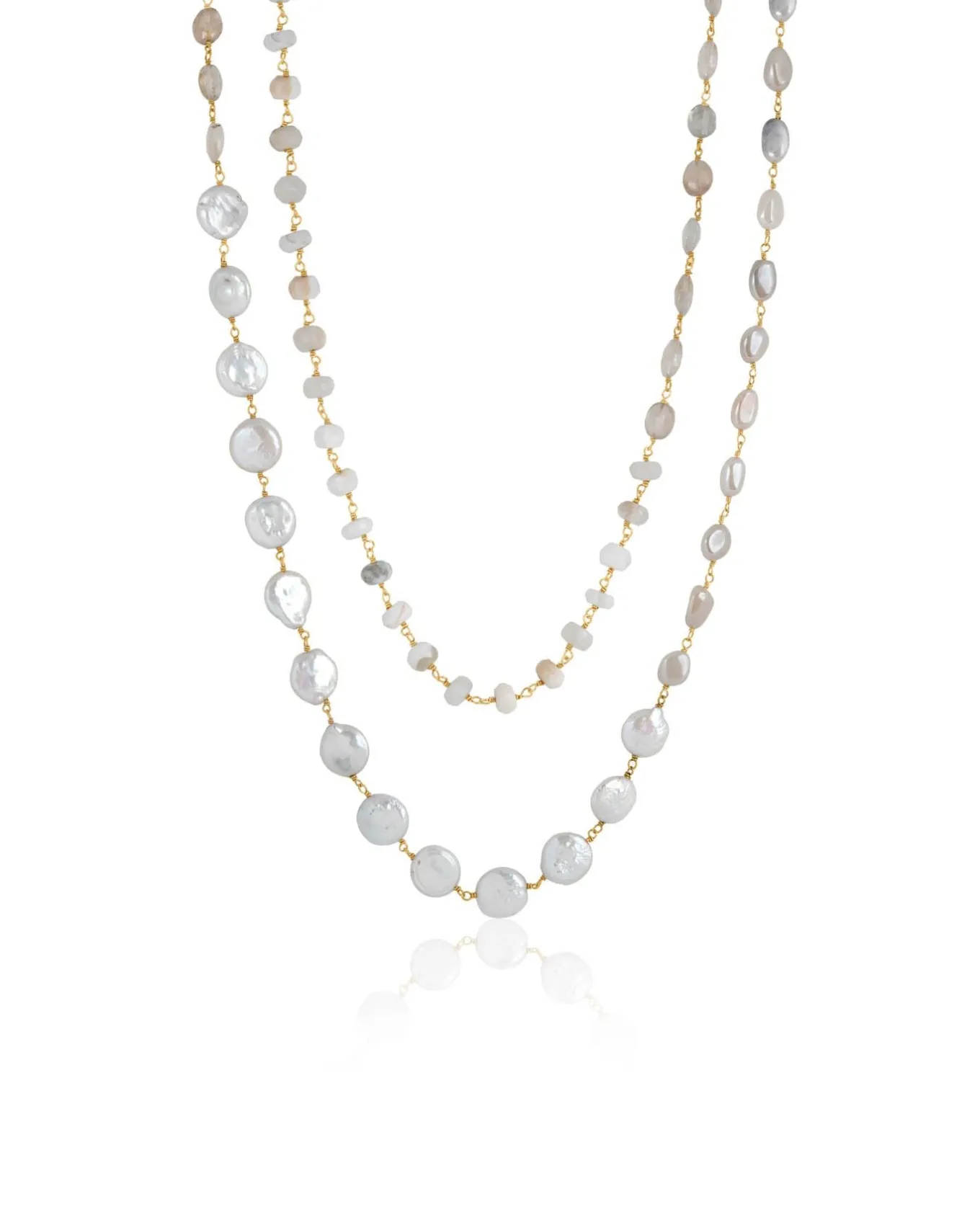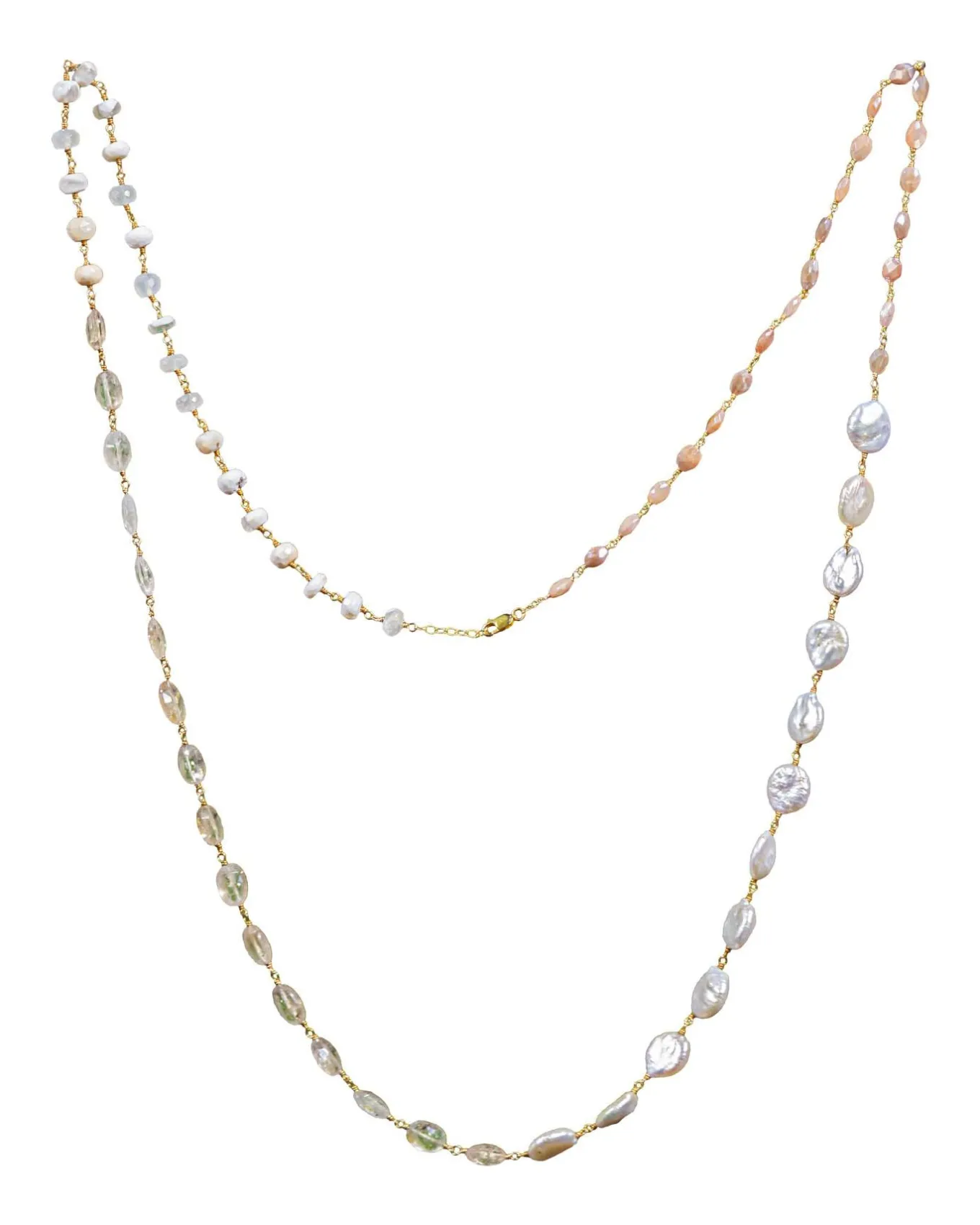 Brown topaz, pearl, white agate and pink moonstone round and oval shaped semi precious stone hand wire wrapped necklace can be worn as a long layer or wrapped, 42″ +2″ extender sterling silver chain plated in 14K yellow gold