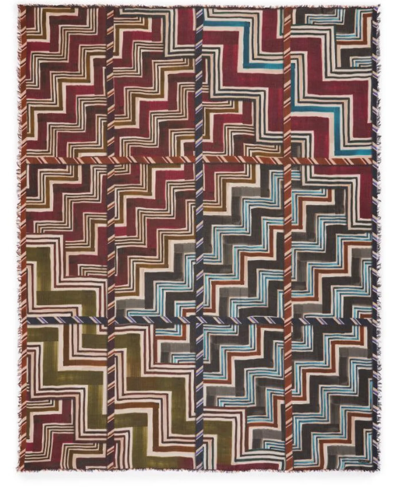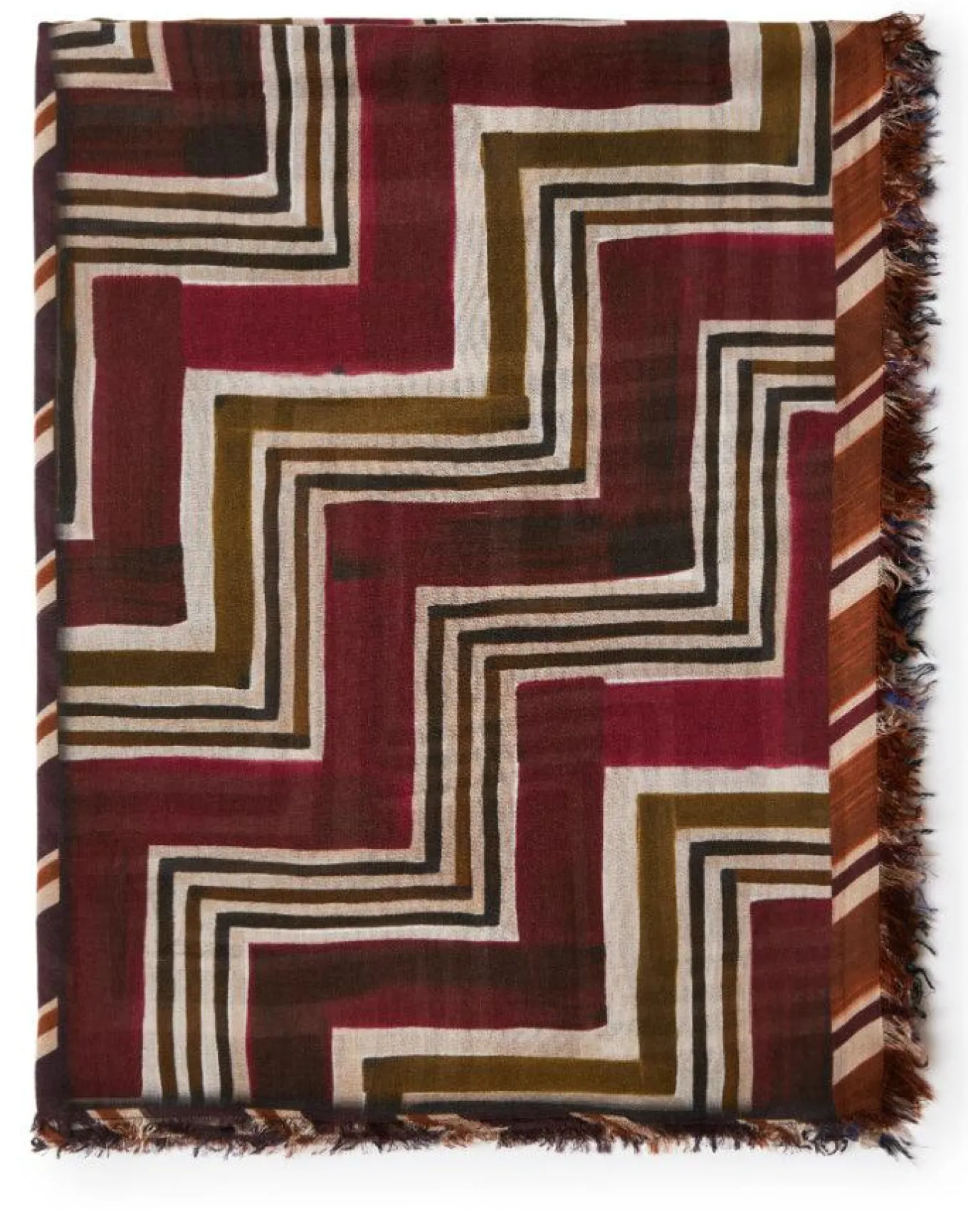 Decorative element recurring in ancient art, now reinterpreted in a modern key. The zigzag pattern has been revisited in a print that recalls the pictorial technique, giving the feeling of wearing a work of art of fabric. The Geometry stole in cashmere blend thanks to the autumn color palette, will be the accessory that will complete with style every casual look.
