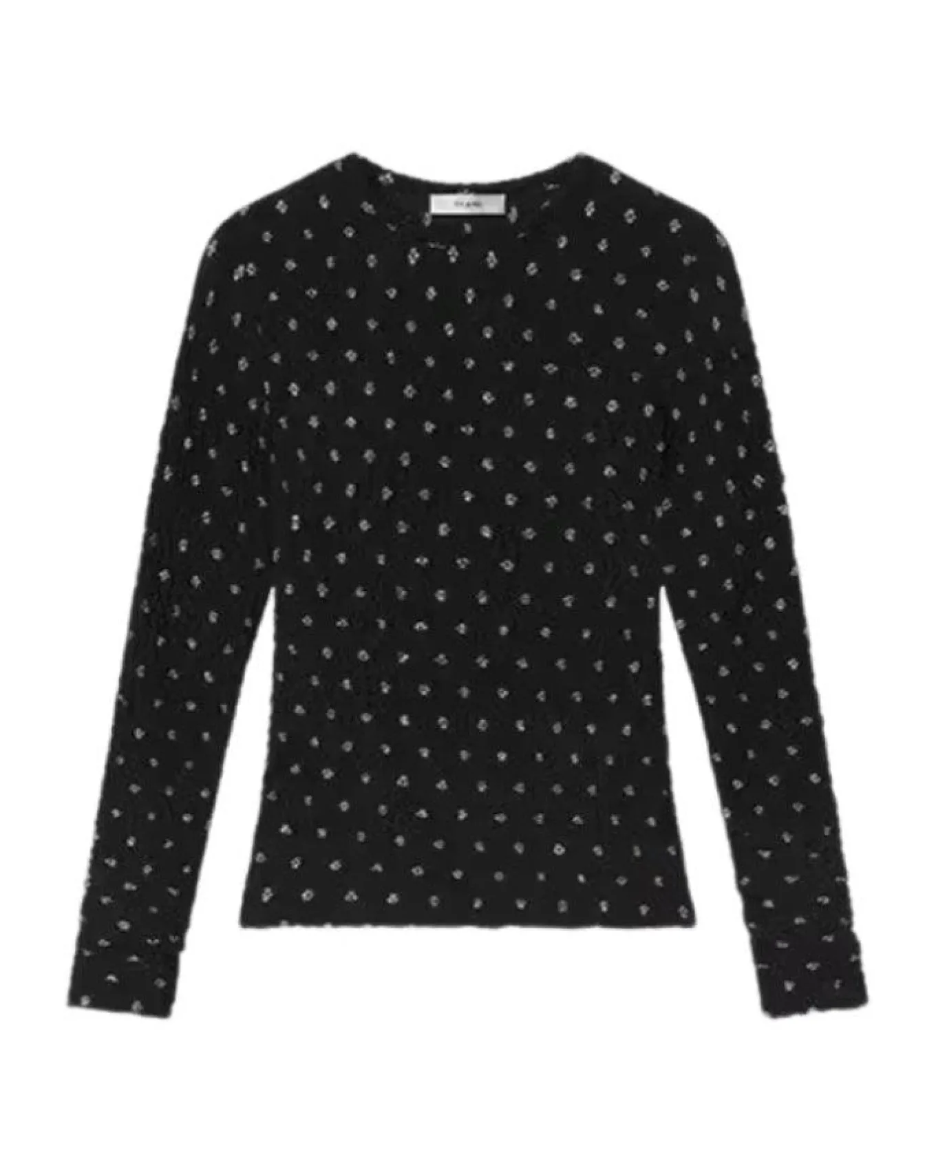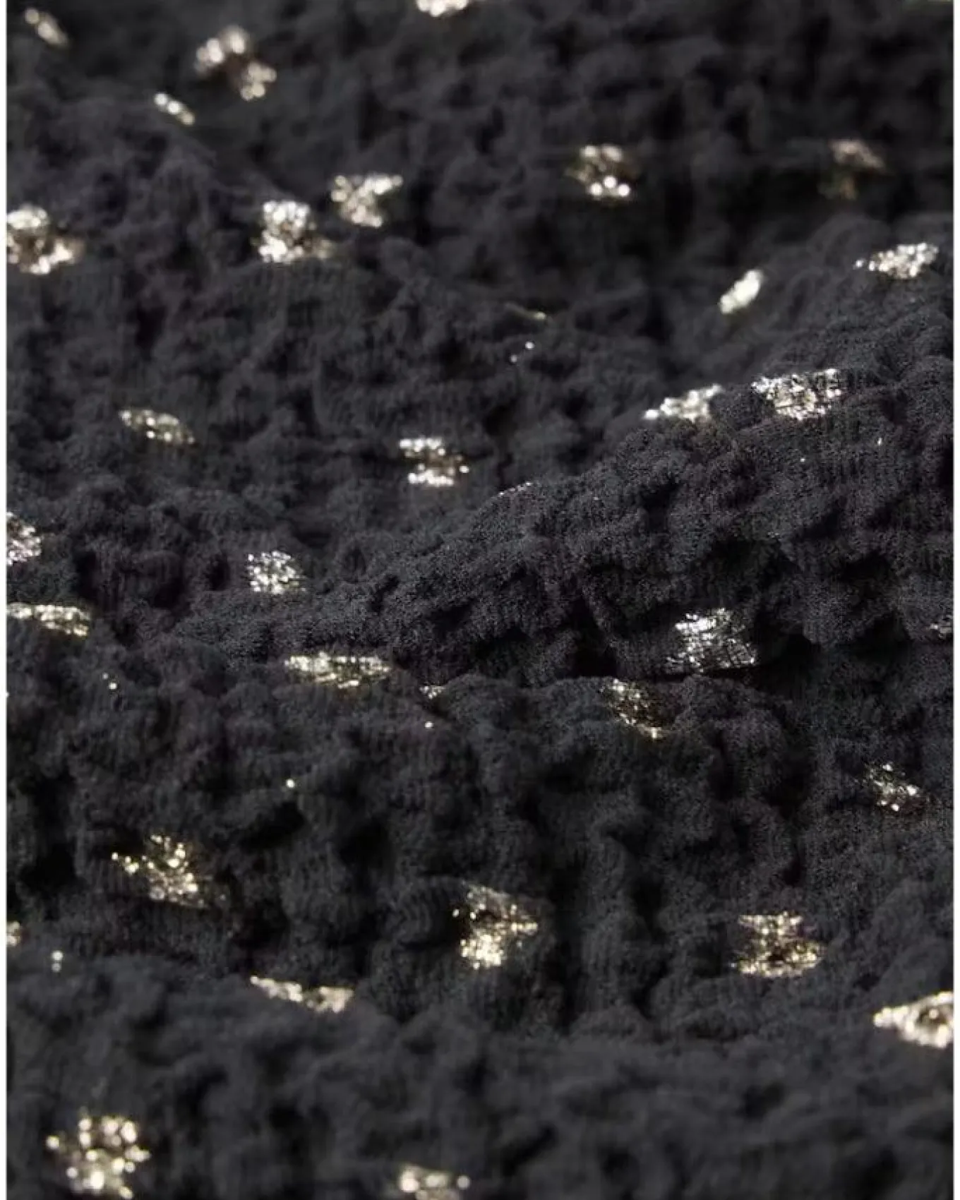 Frame close fitting cut top stretches into a semi-sheer, textured fabric embellished by gold lurex dots, Length 22″.