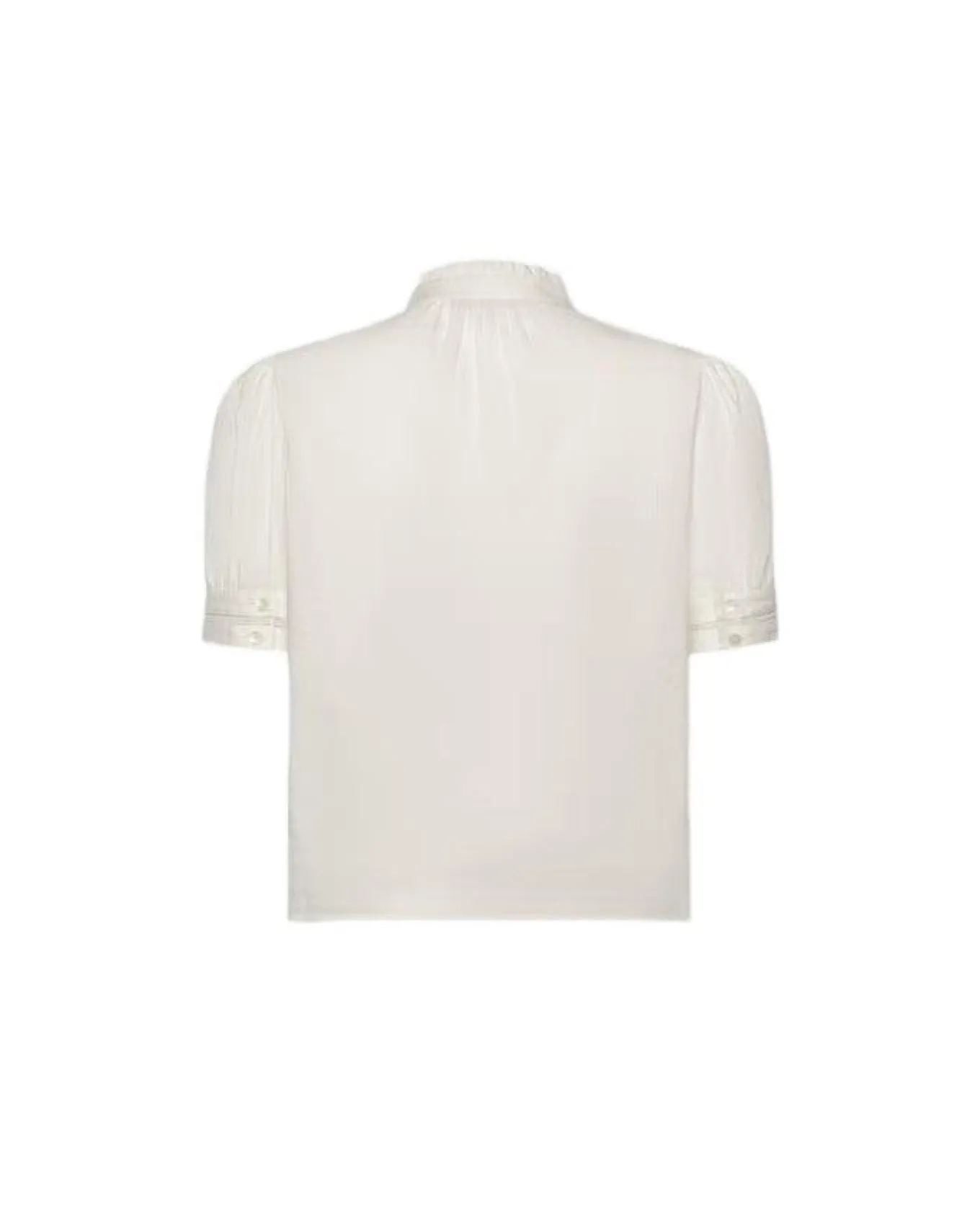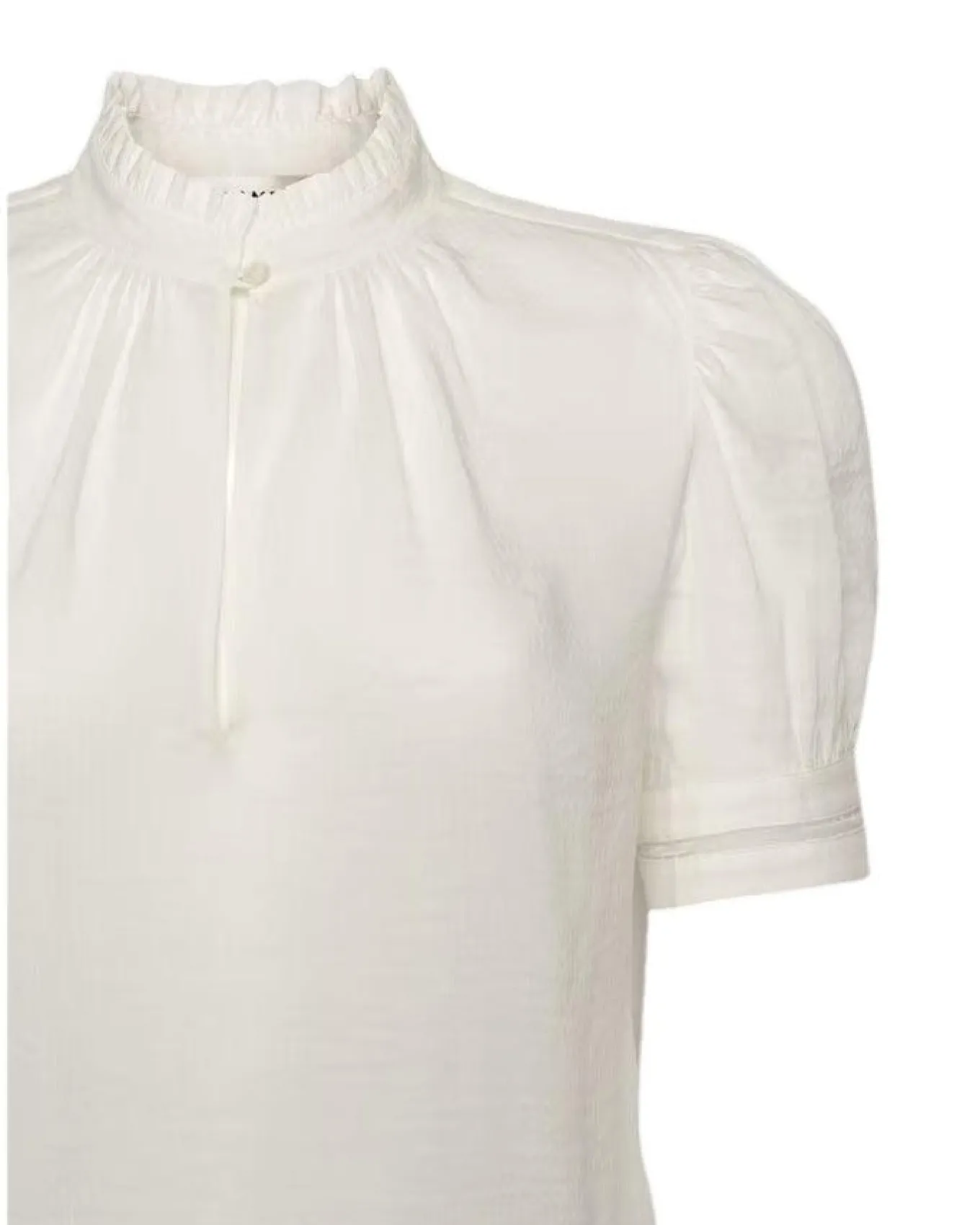 Frame linen rayon blouse with slight puff sleeves, a ruffle stand collar, keyhole neckline and lace inset details.