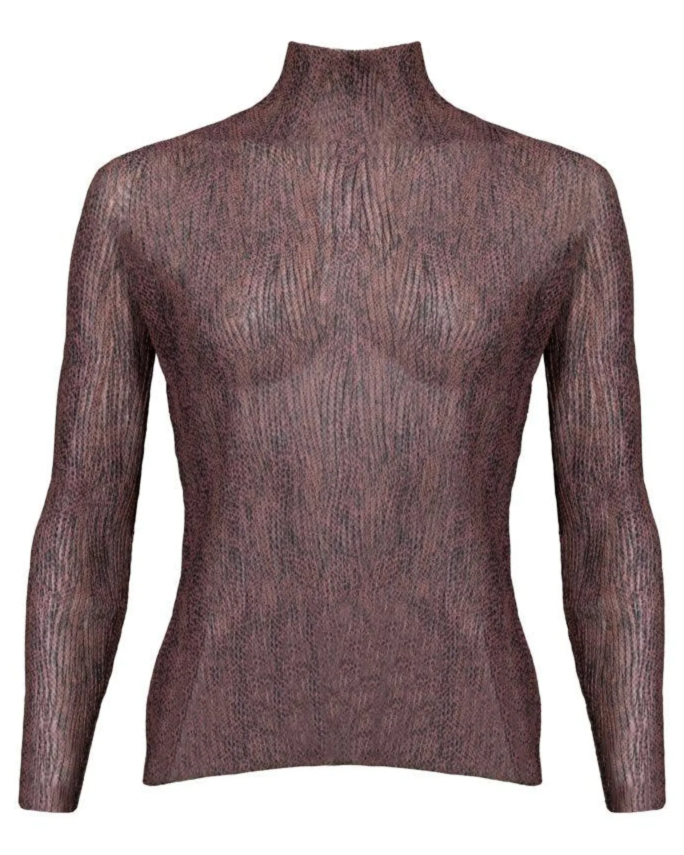 Hugo Boss feminine long sleeve turtleneck top in alightweight tulle with plisse pleats and raw edges.