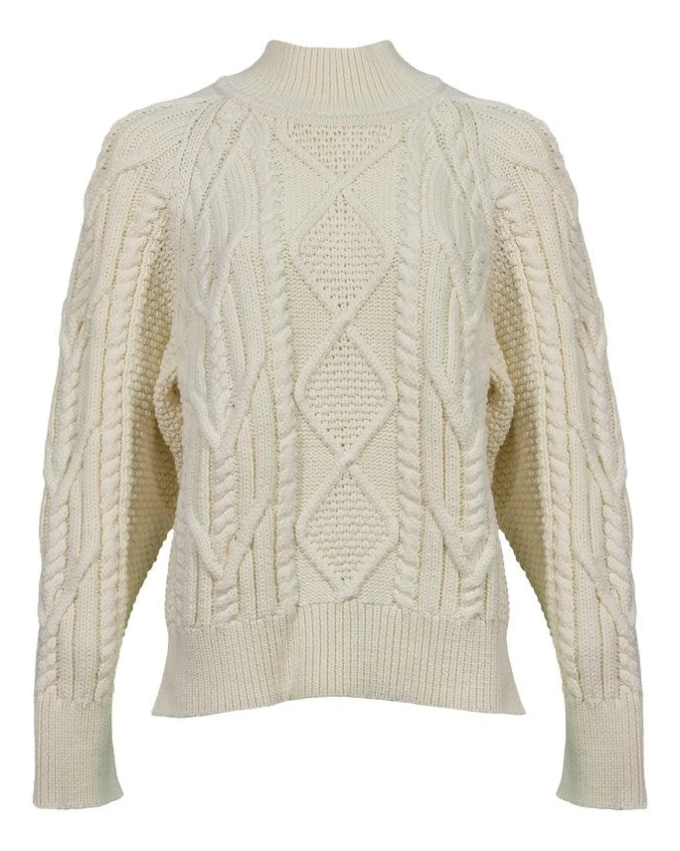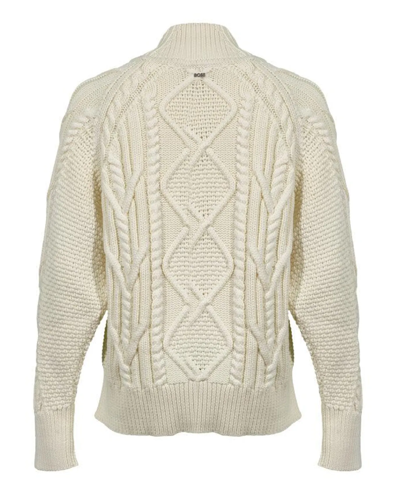 Hugo Boss cozy patterned cable knit sweater with a mock neck and ribbed trim.