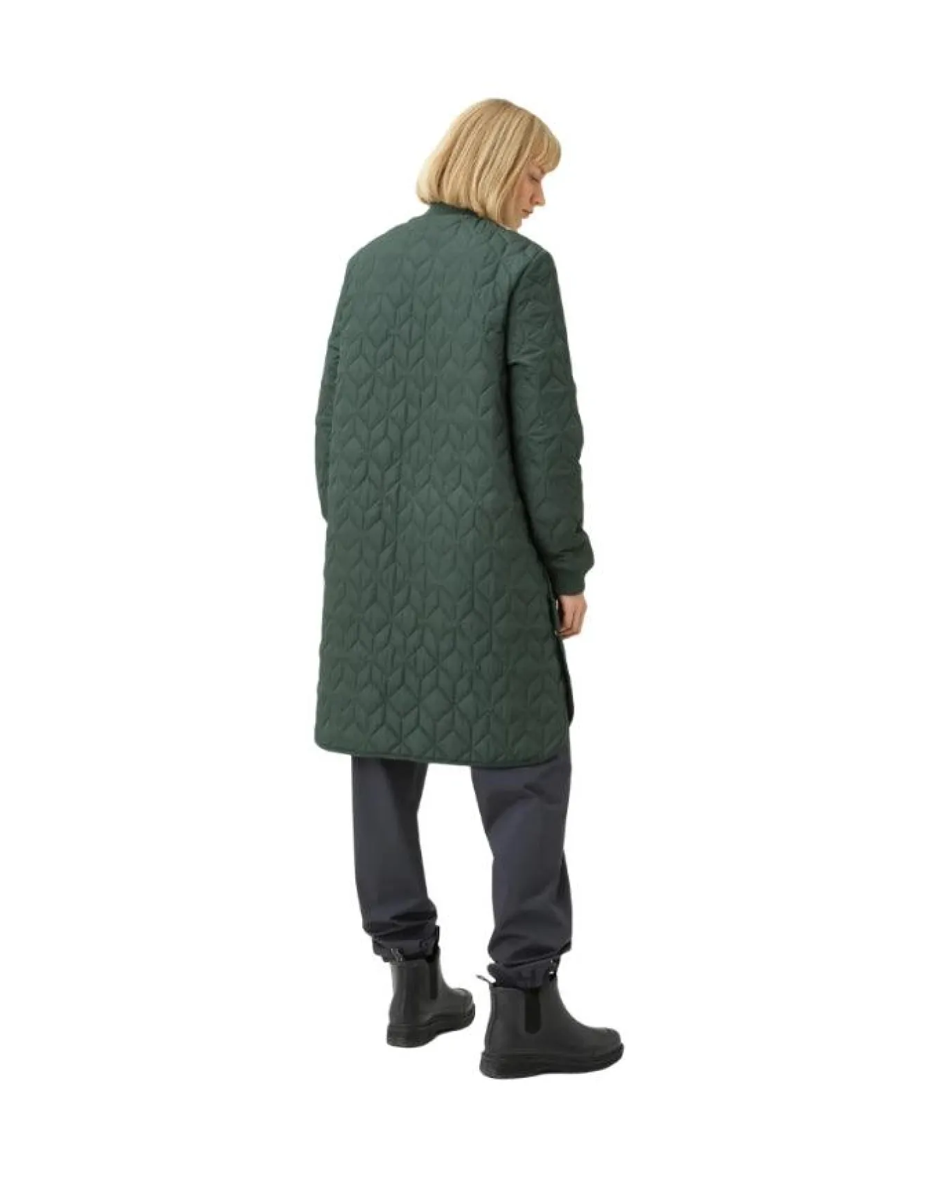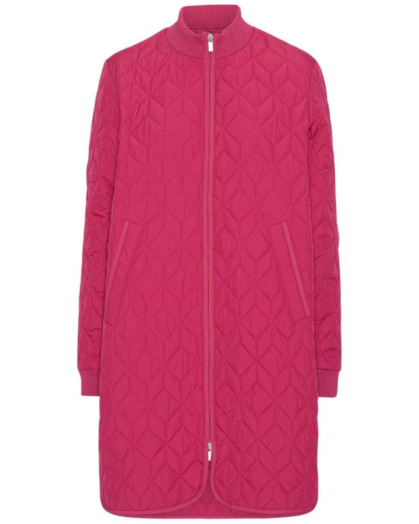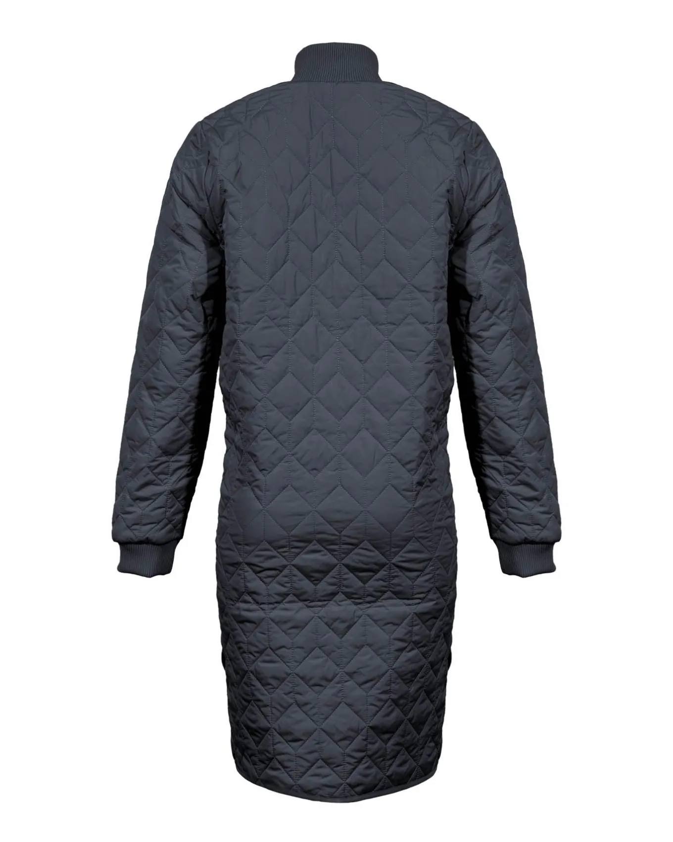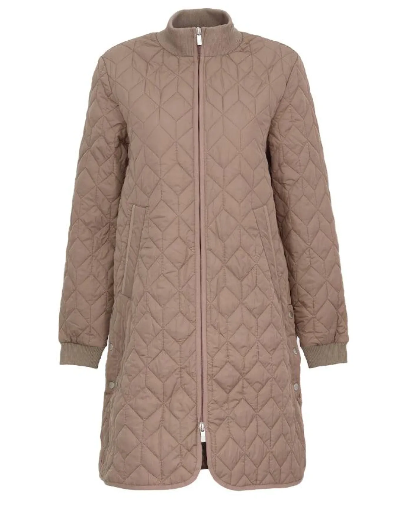 Quilted coat with a 2-way zipper down center front, slightly A-shaped, side slits with logo press button closure, slightly longer at back, rib collar and cuffs and front pockets