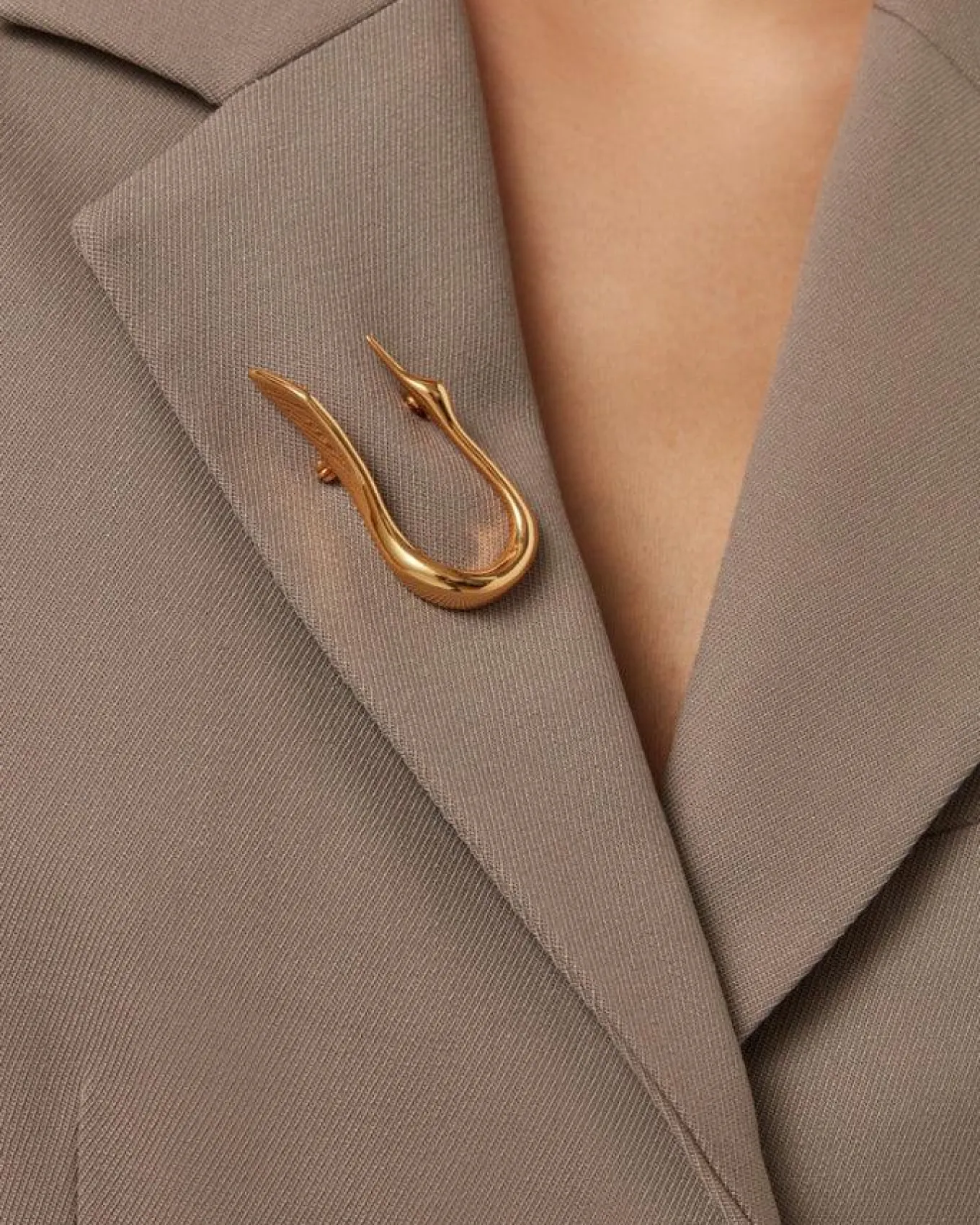 Jenny Bird’s new brooch featuring the elongated profile of the egret bird. Outfitted with a pin on a hinge.