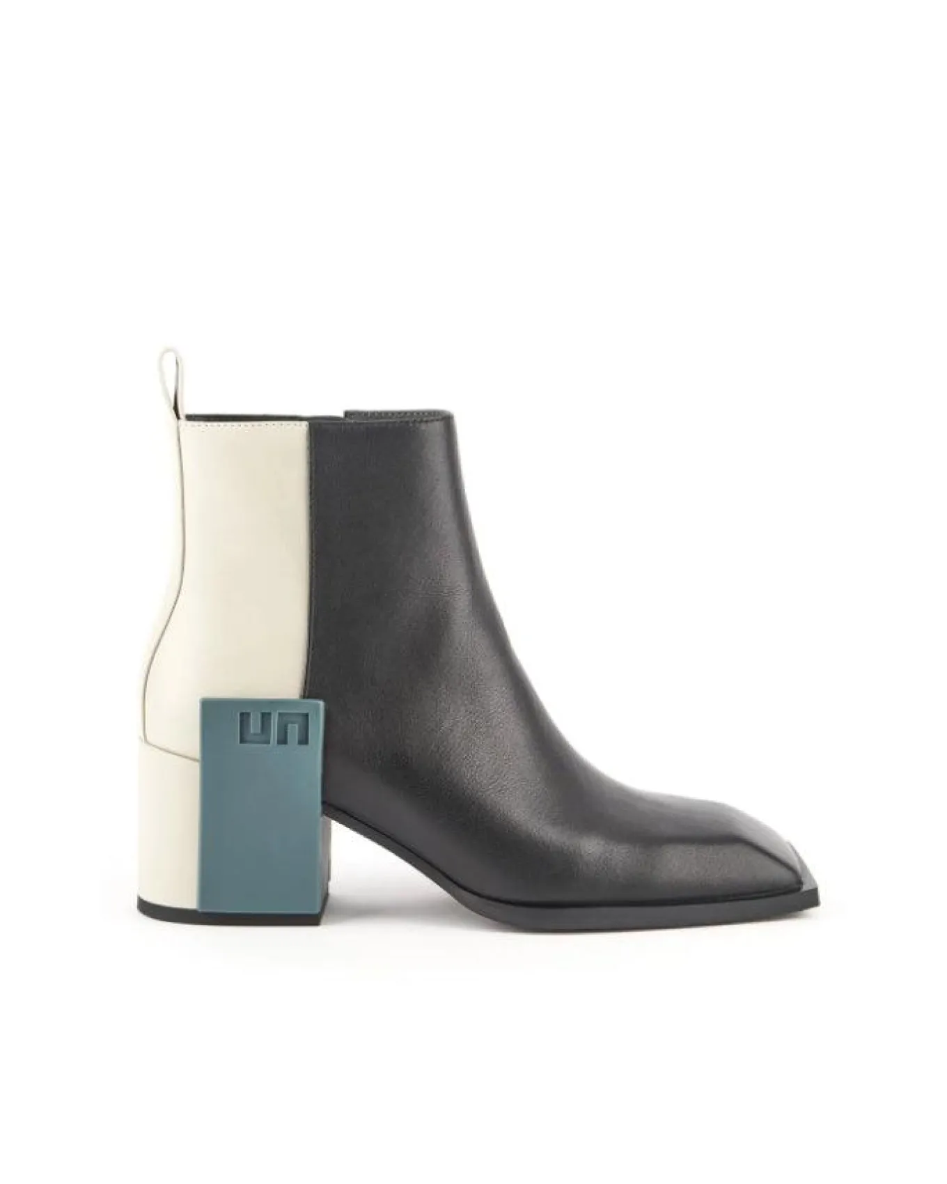 Two tone nappa leather ankle boot with a mid 2.56″ heel,side zip, an angular toe and a statement logo block, standard fit