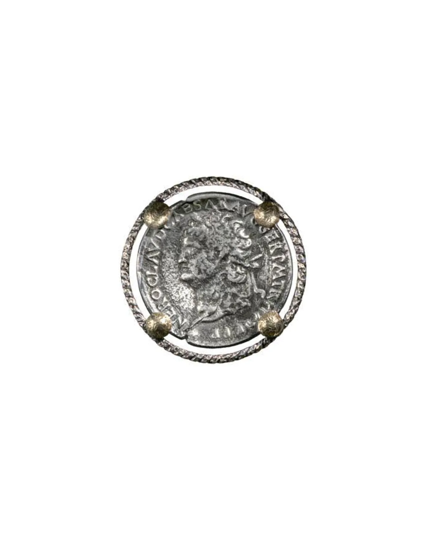 Karyn Chopik made exclusively for Blu’s , a silver Roman coin pin with sterling silver outer ring and bronze ball detail.