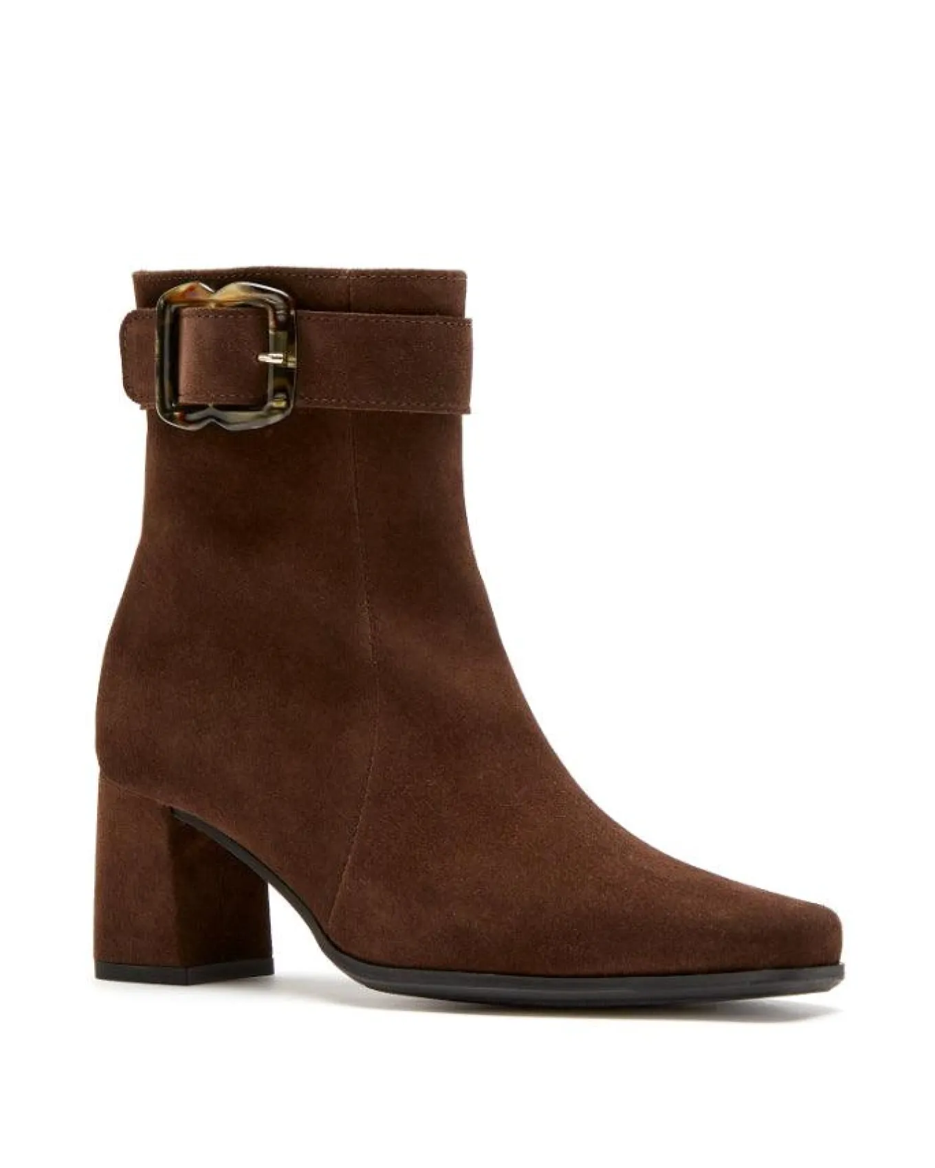 La Canadienne Italian calf suede ankle boot with soft square toes characters, decorative side buckle, interior side zipper, breathable microfiber lining, memory foam insole with a cushioned memory foam heel pad, flexible TPR (thermoplastic rubber) sole provides traction on wet surfaces, 2.5″ high covered block heel and rubber sole.