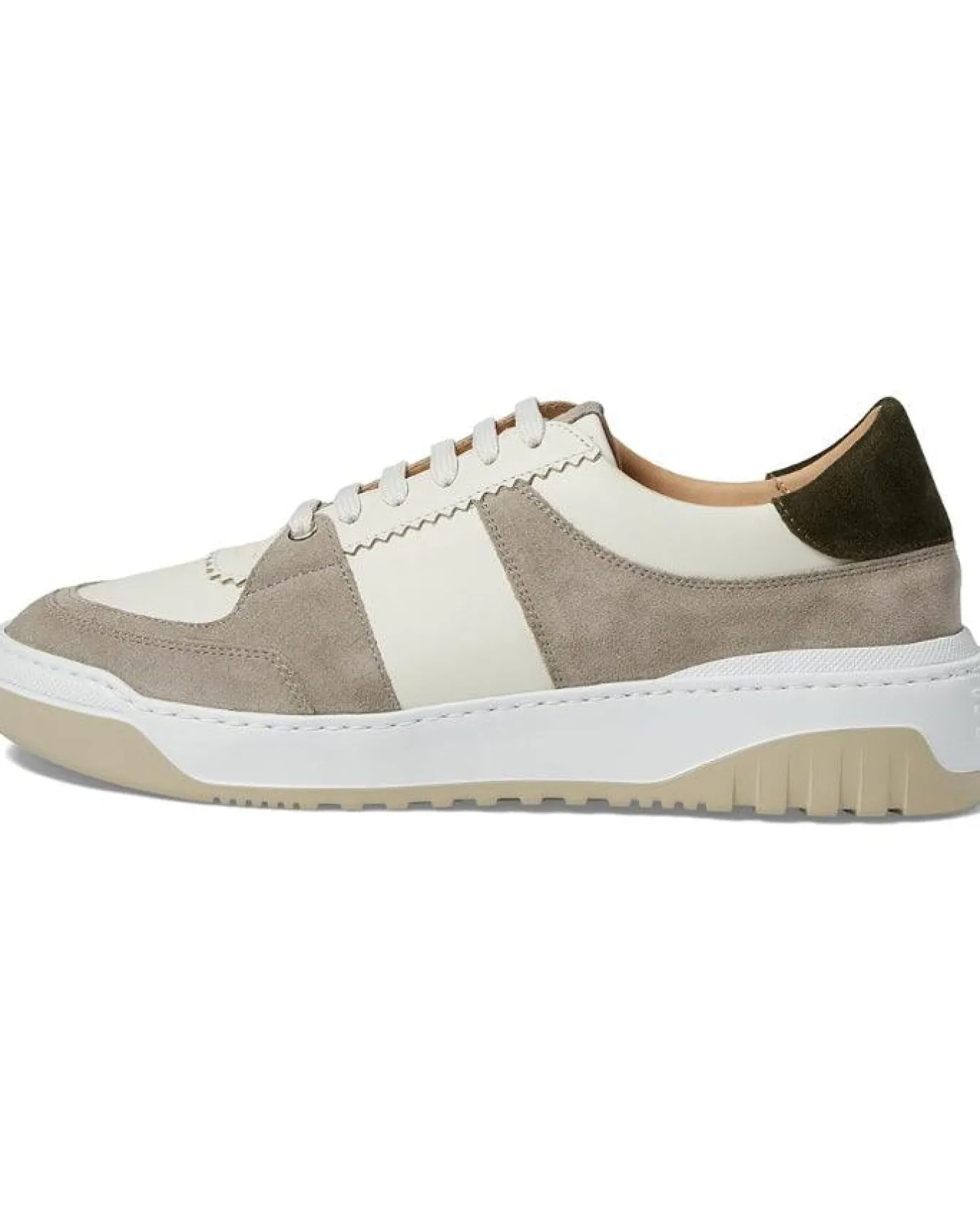 La Canadienne premium leather and soft suede lace up sneaker with contrasting color panels, an XL extra light rubber sole, 1.75″ heel, sheepskin lining and a removable insole.