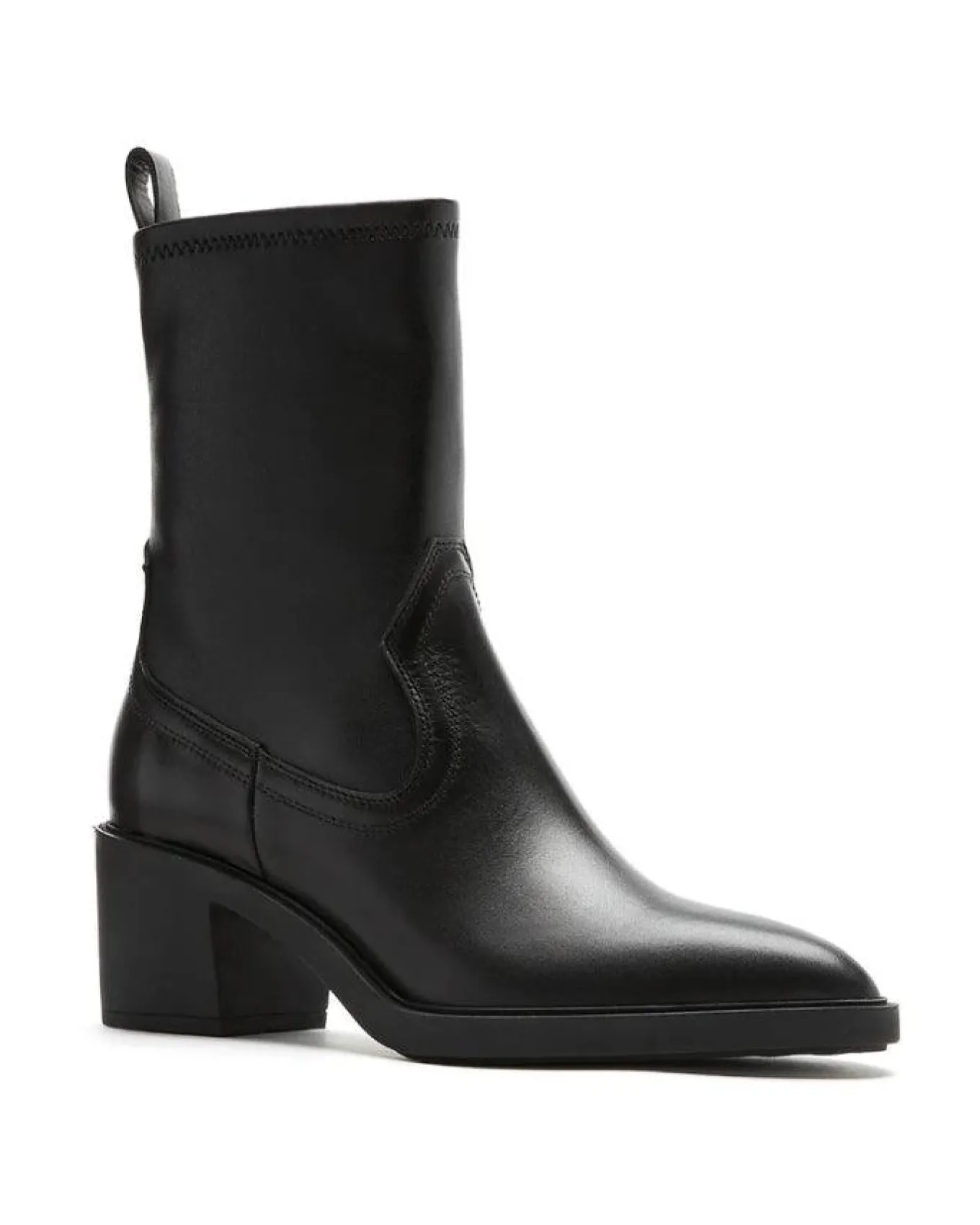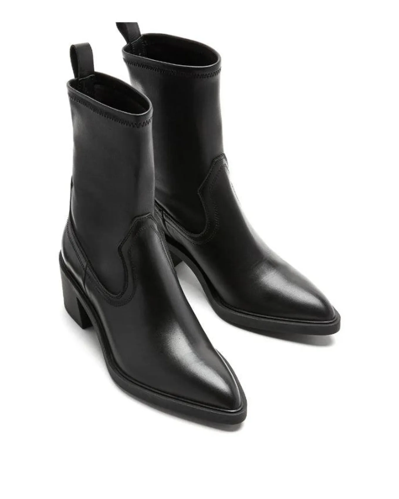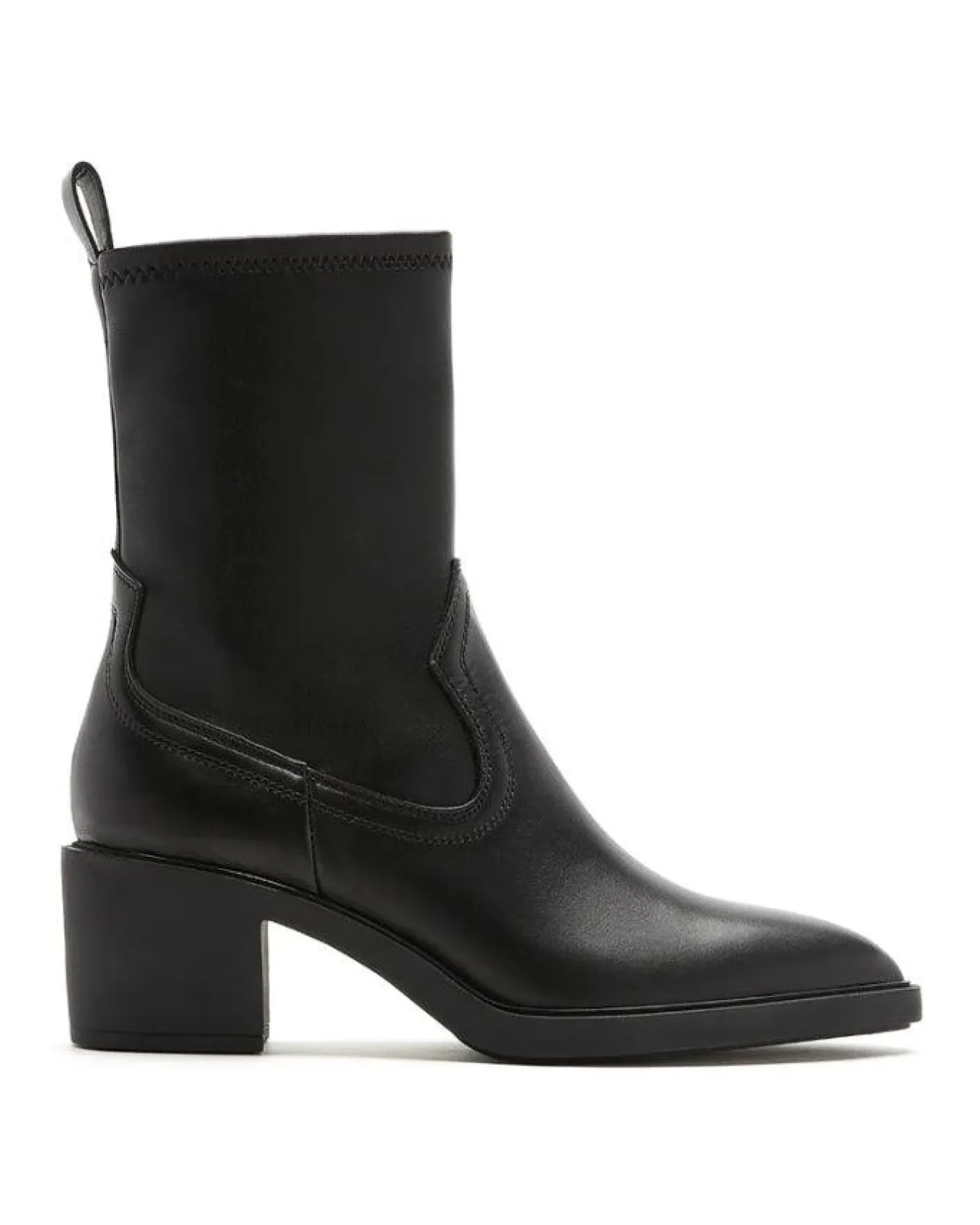La Canadienne western style leather boots features point toe, delicate stitching, rubber sole with 2.5″ mid heel and 0.5″ platform, pull on tab construction.